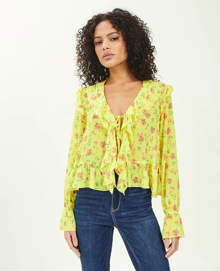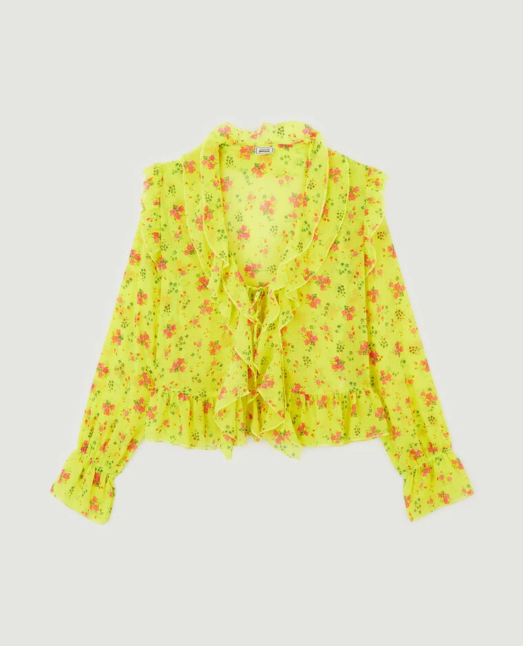 – Blouse en tissu léger jaune avec fleurs roses et vertes.