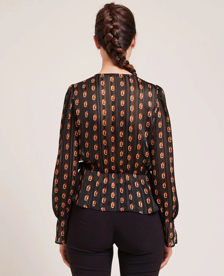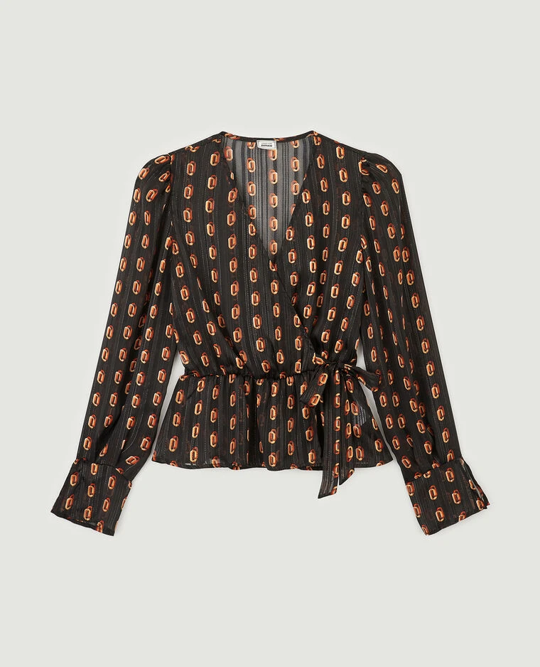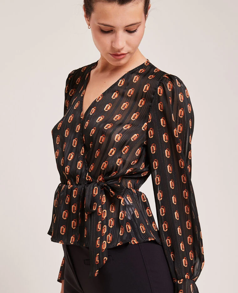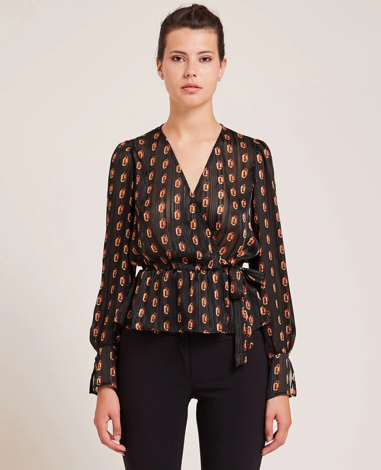 – Blouse cache en tissu léger et transparent noir, orange et beige avec rayures fils métallisés.