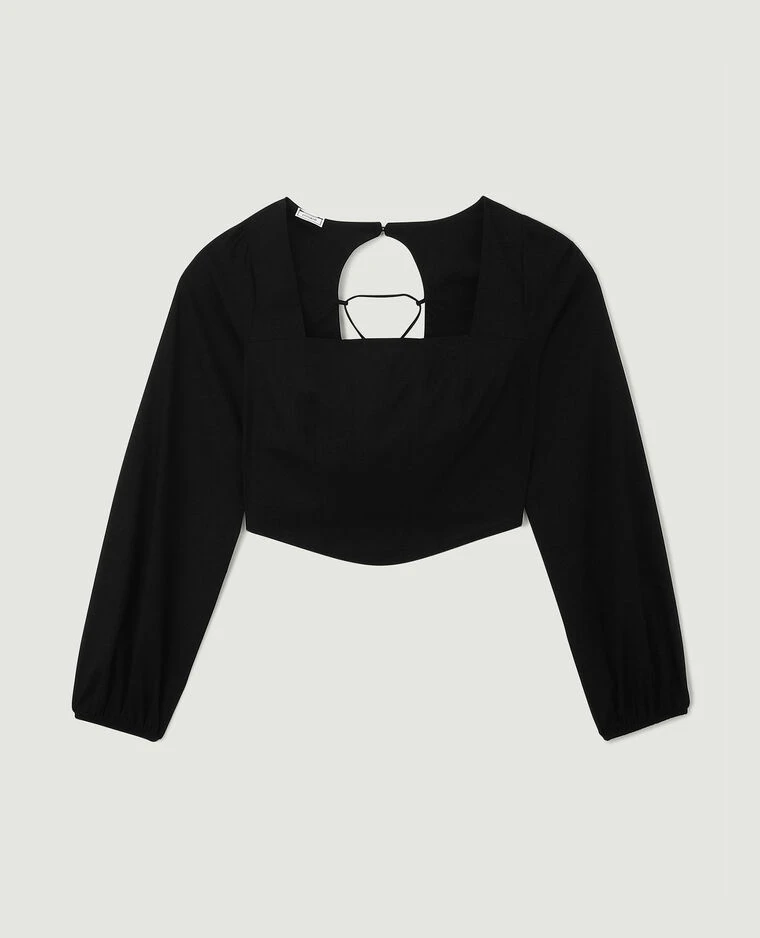 – Dos avec découpe + petit bouton + lien à croiser et nouer.