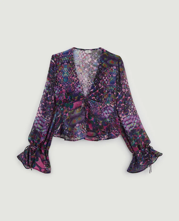 – Blouse en tissu fluide violet, rose, vert, bleu.