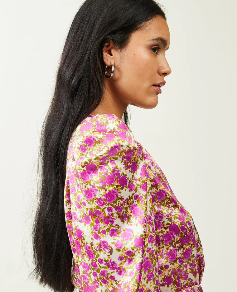 – Blouse en tissu satiné blanc cassé avec fleurs rose fuschia et vertes.