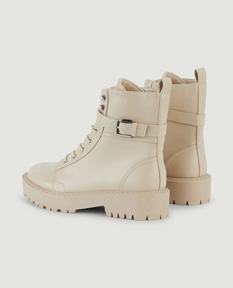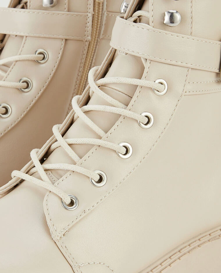 – Boots à lacets en matière synthétique effet cuir lisse beige.