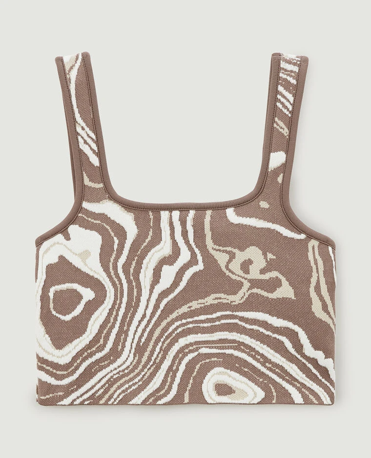 – Brassière en maille tricot marron avec motifs blancs et beiges.