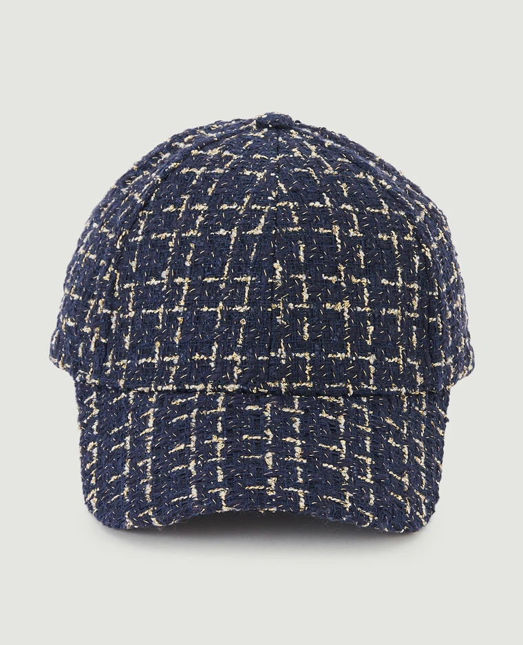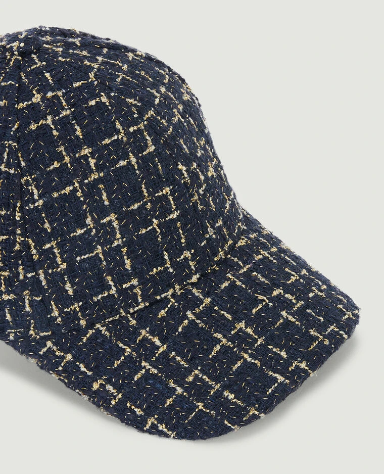 – Casquette en tweed bleu marine avec fils lurex dorés.