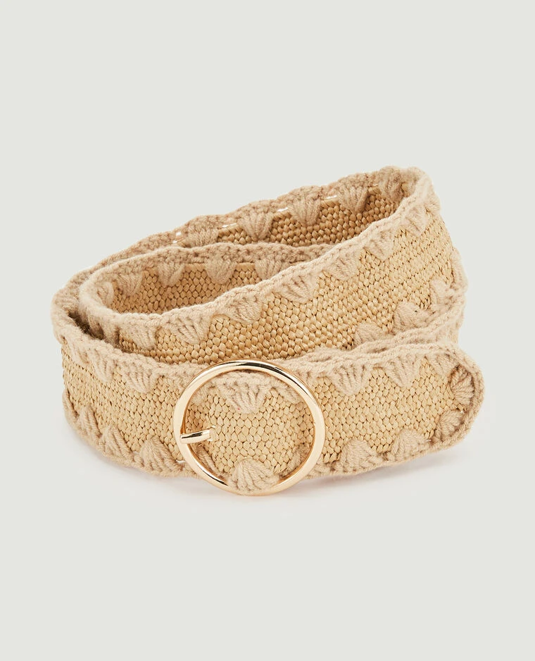 – Ceinture beige en paille avec laine brodée de chaque côté.