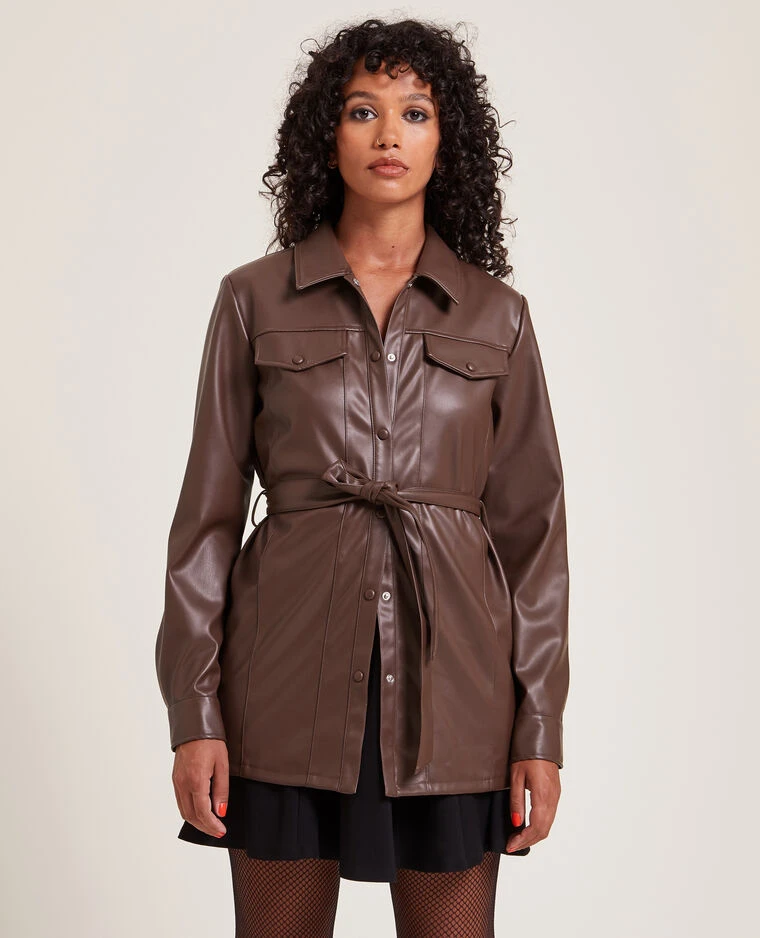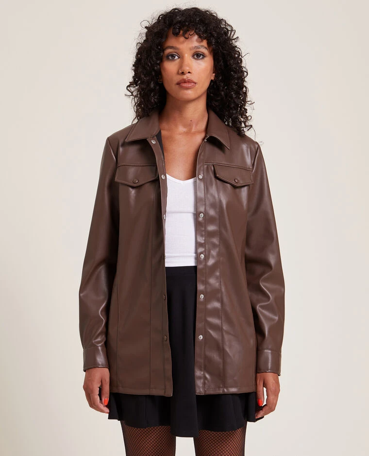 – Chemise longue en matiĂšre synthĂ©tique effet cuir lisse marron chocolat.