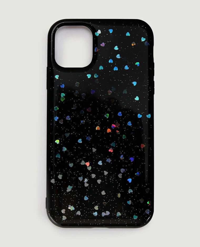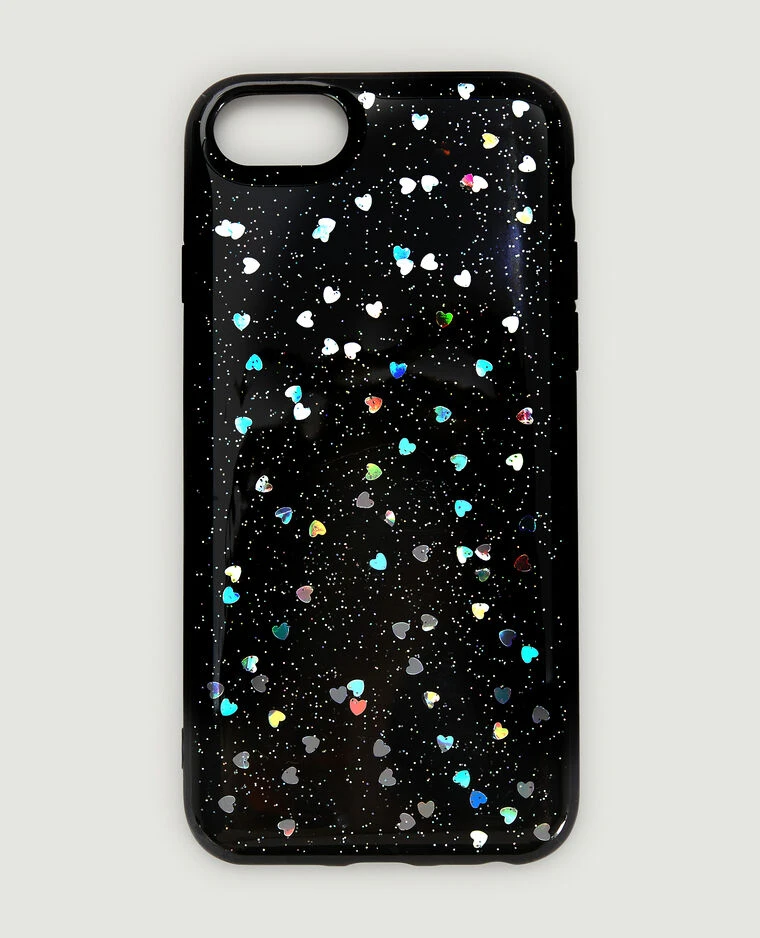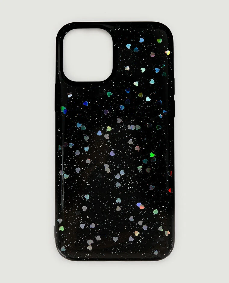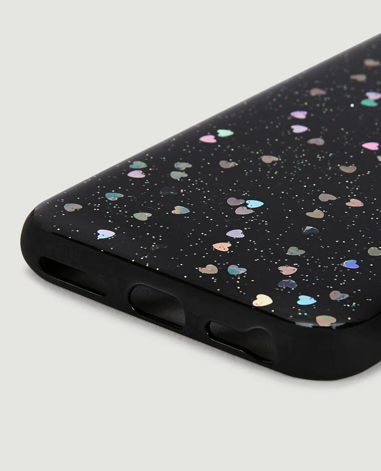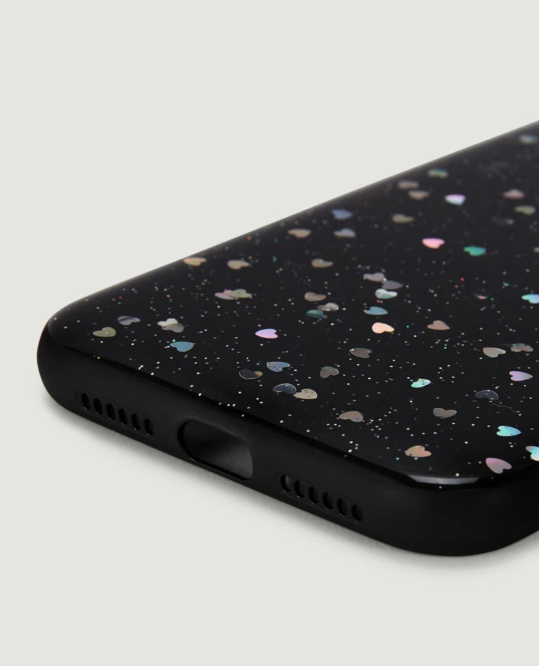 – Coque de téléphone iPhone en plastique noir avec paillettes et petits cœurs argentés.