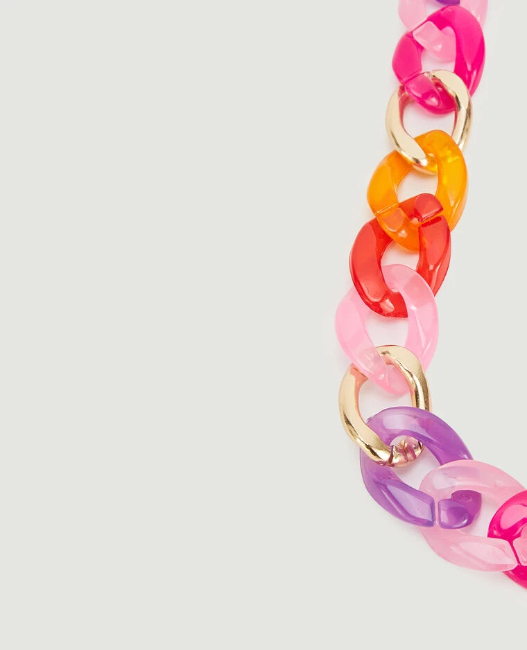 – Dragonne de téléphone en grosse chaine en plastique rose, violet, orange, rouge et doré.