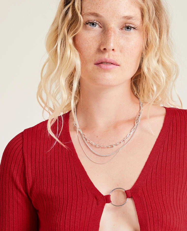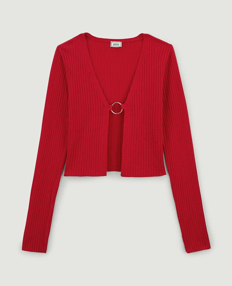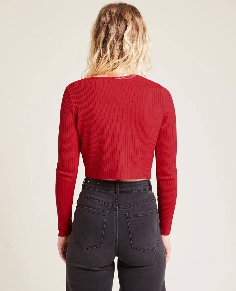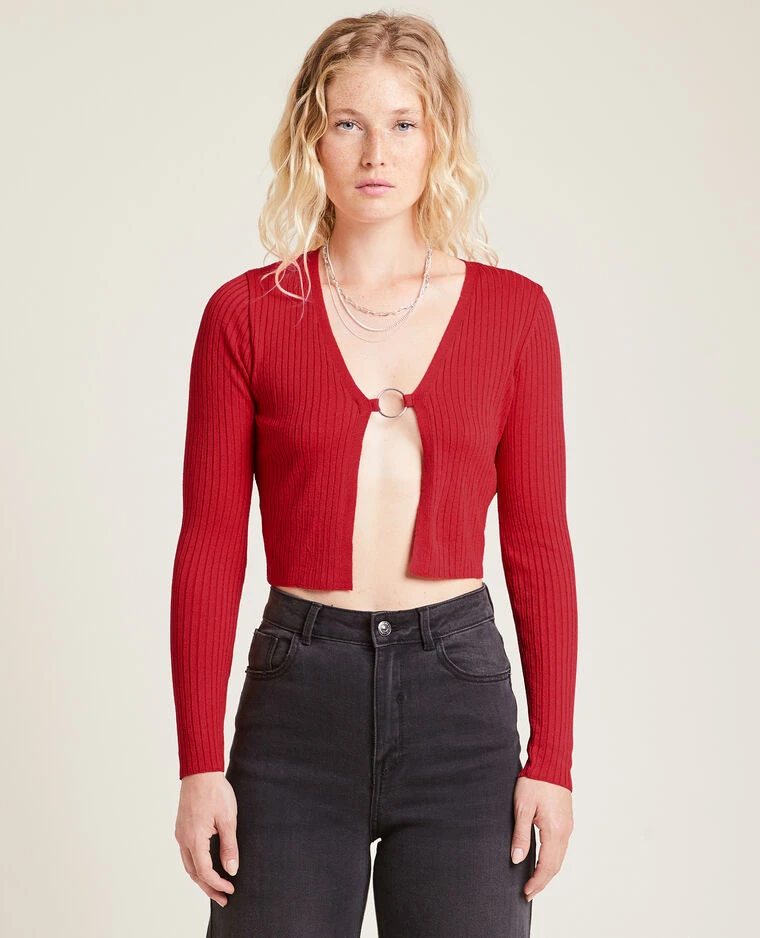 – Gilet court en maille côtelée rouge.