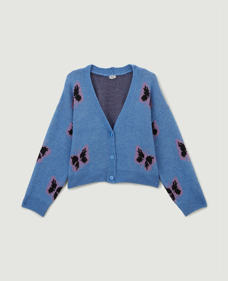 – Gilet en maille bleu ciel avec papillons roses et noirs.