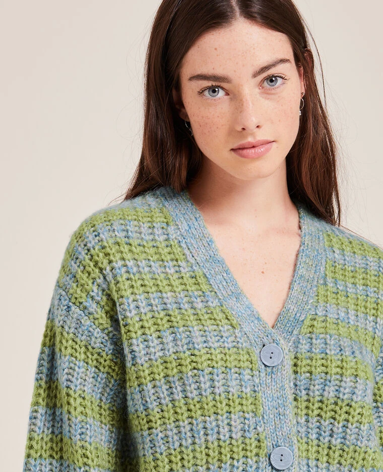 – Gilet court en grosses mailles rayĂ© vert et bleu.