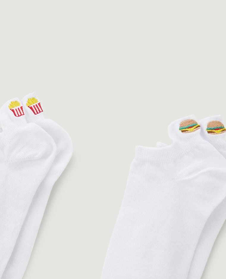 – Lot de 2 paires de socquettes blanches : 1 avec broderie burger + 1 avec broderie frites.