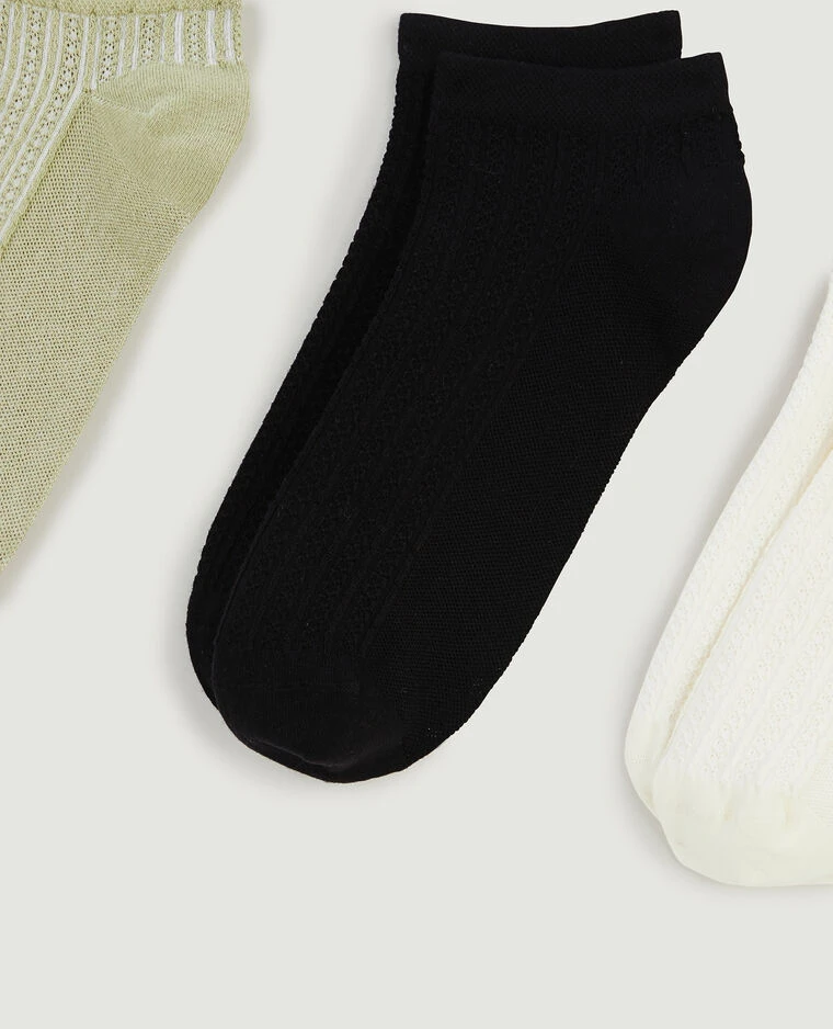 – Lot de 3 paires de socquettes : 1 vert olive + 1 noire + 1 blanc cassĂ©.