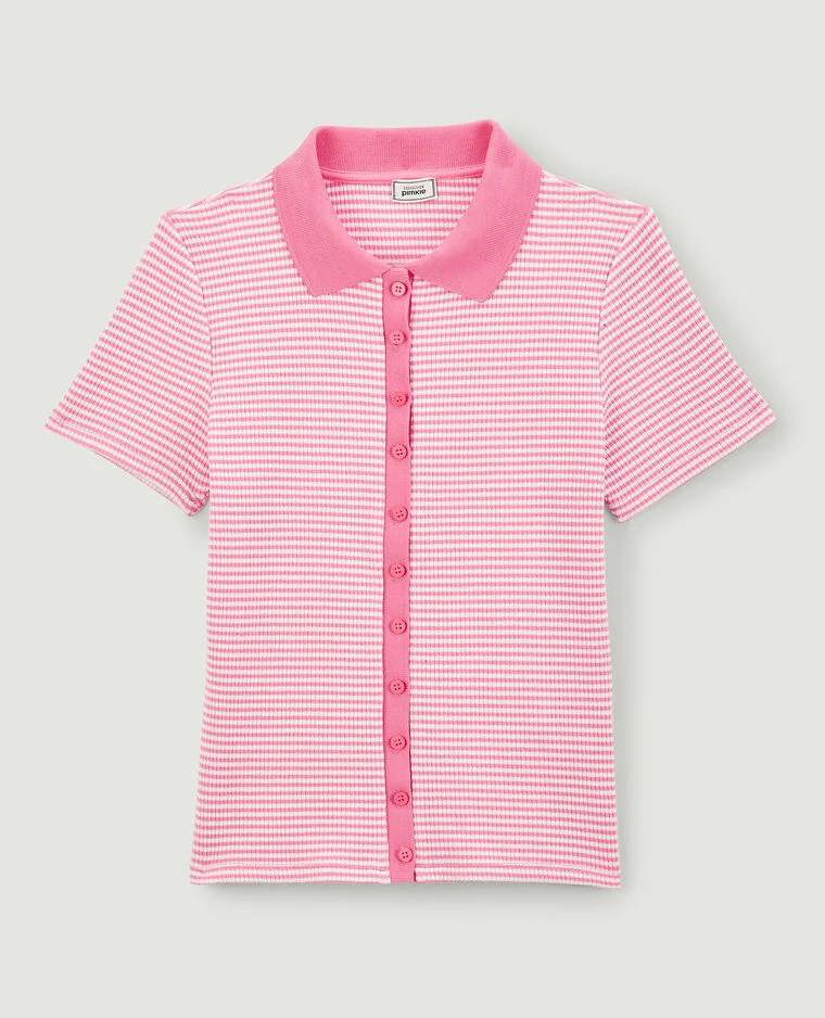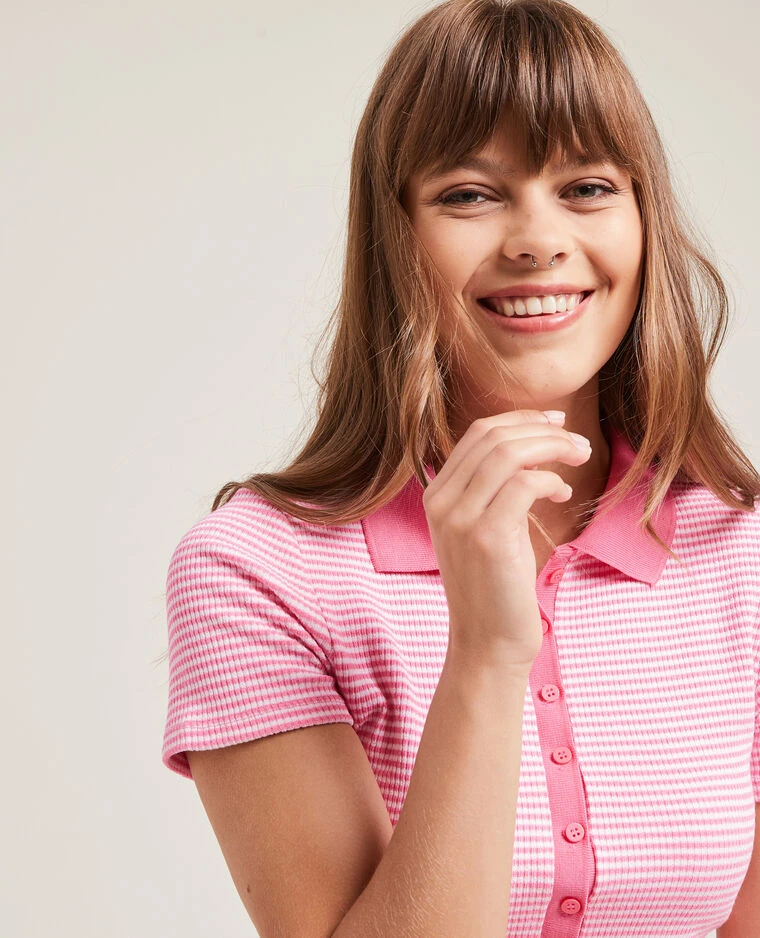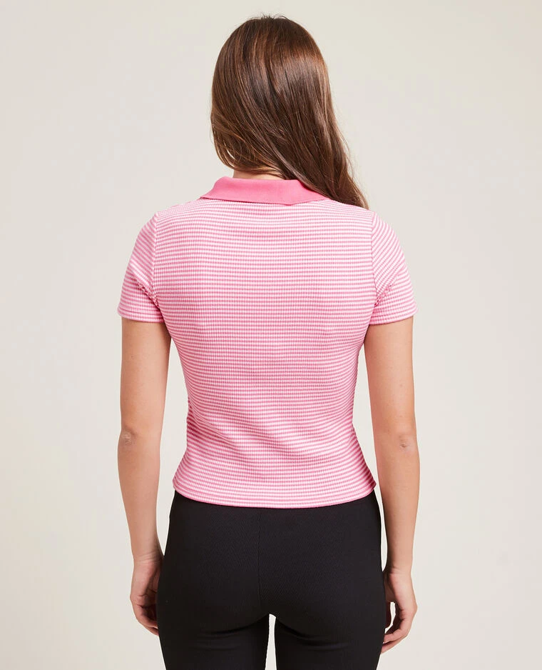 – Polo rayé rose et blanc en maille côtelée et extensible.