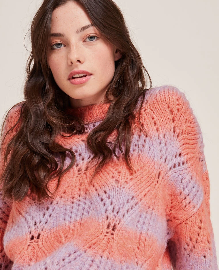– Pull bicolore rose et orange en maille fantaisie ajourée.
