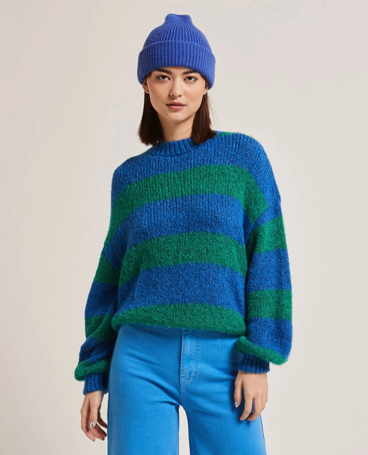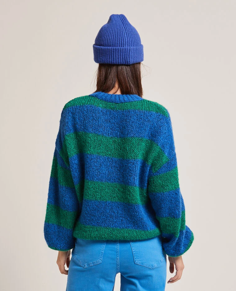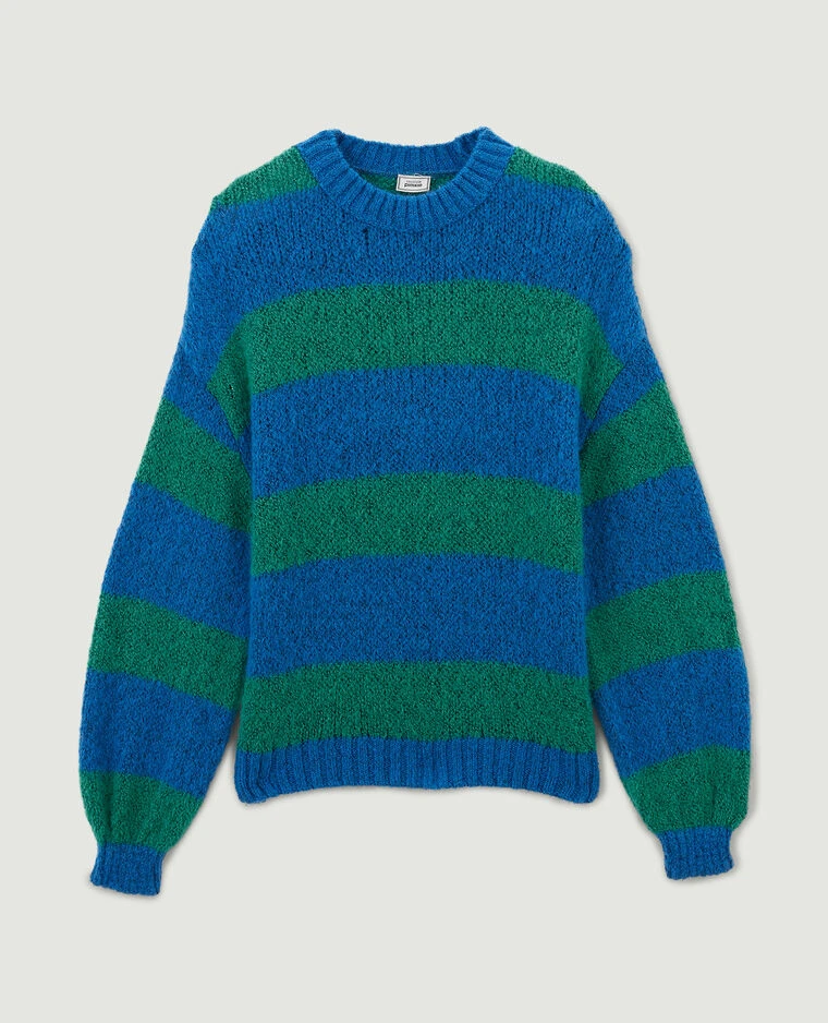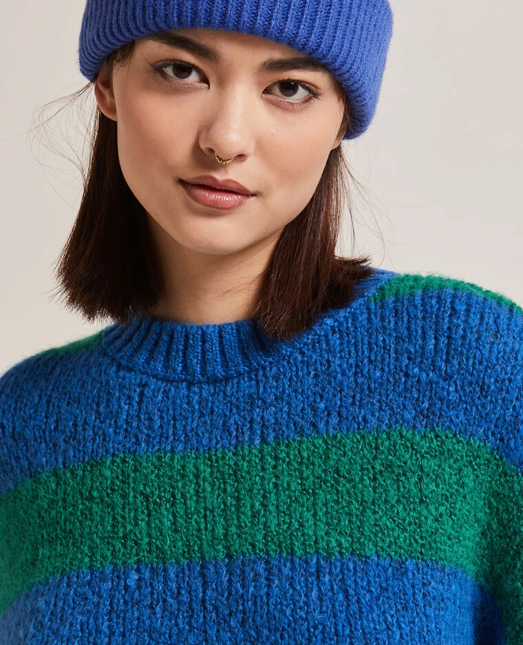 – Pull col rond en maille rayée bleue et verte.