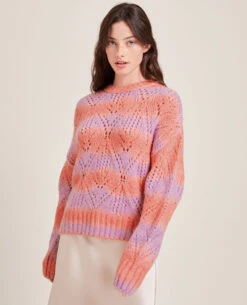 – Pull court en maille beige avec dĂ©tails rose fluo.