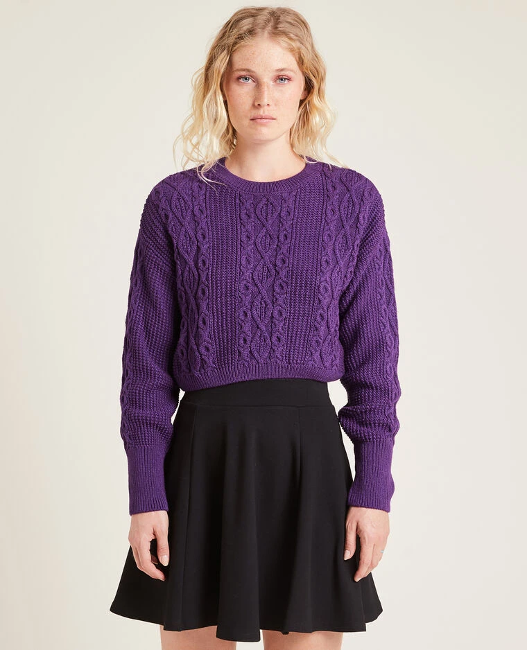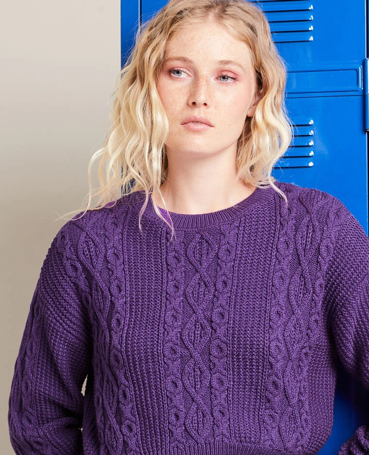 – Pull cropped violet en maille torsadée devant et le long des manches.