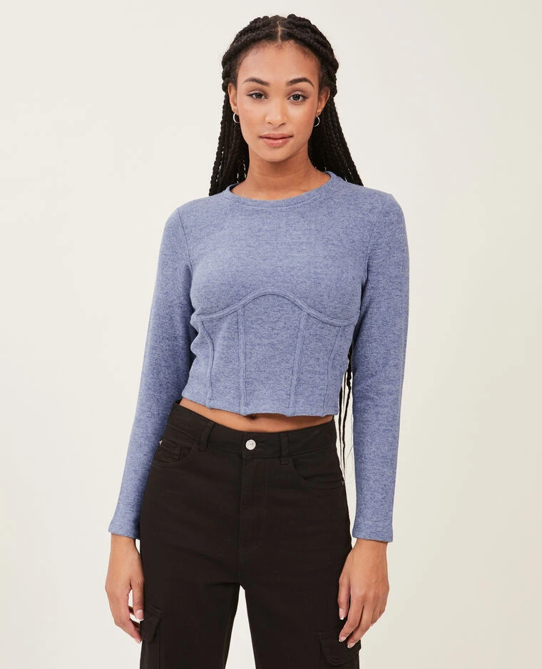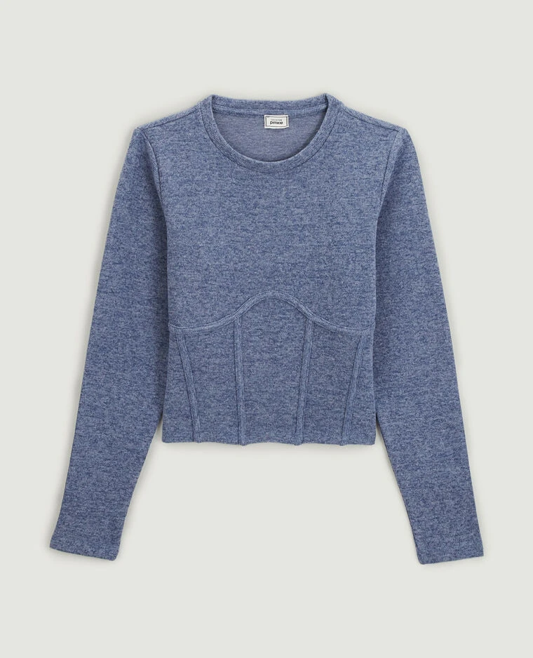 – Pull court col rond bleu chiné.
