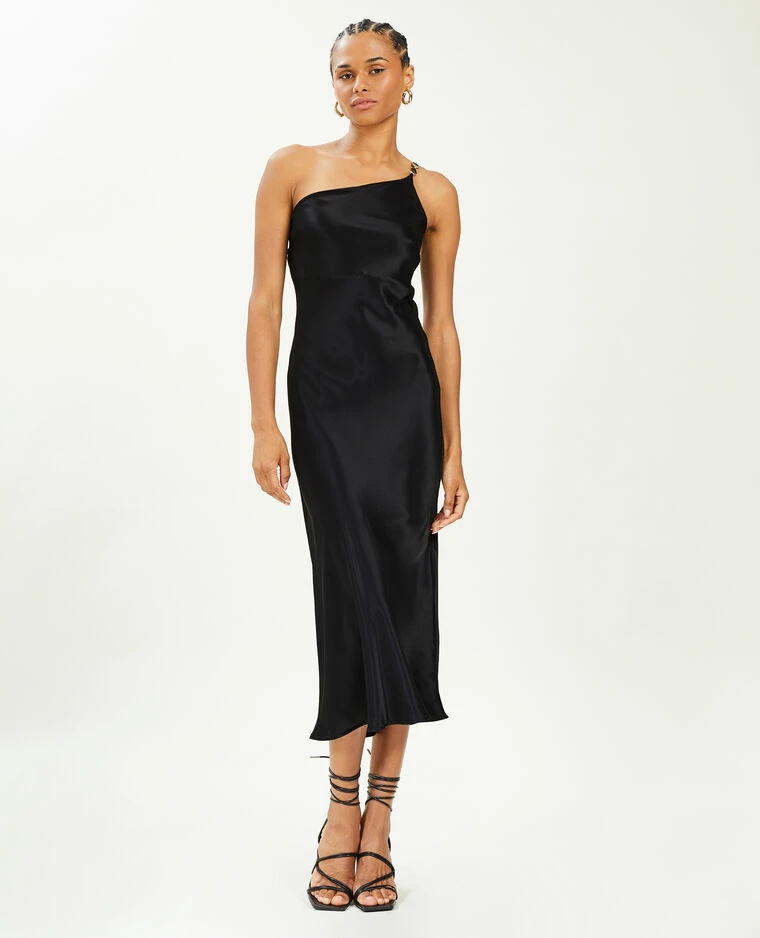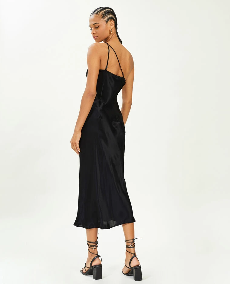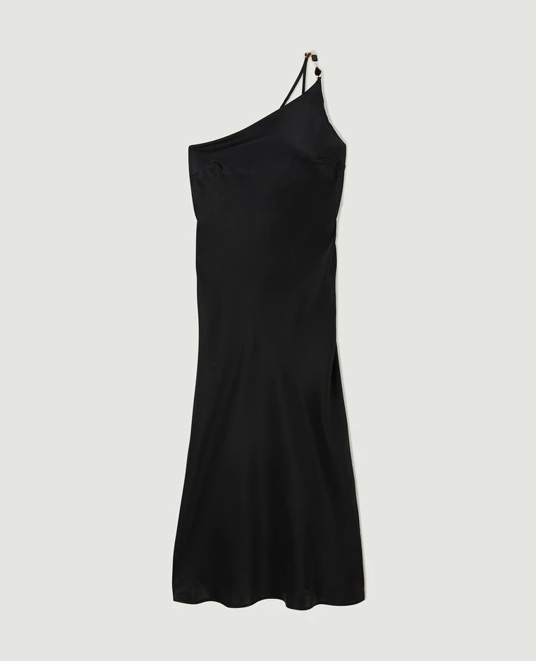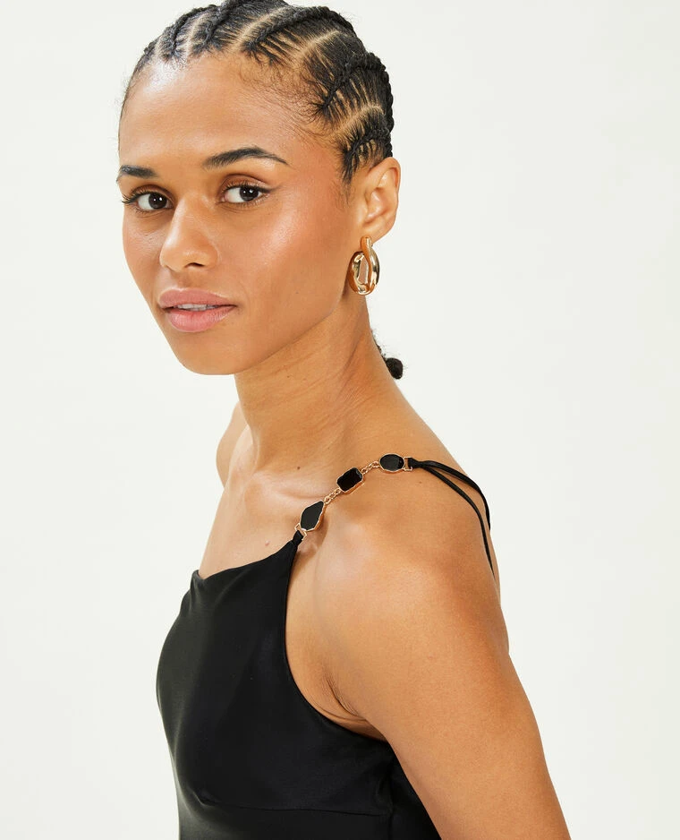 – Bretelle gauche avec bijoux métalliques couleur or et noir.