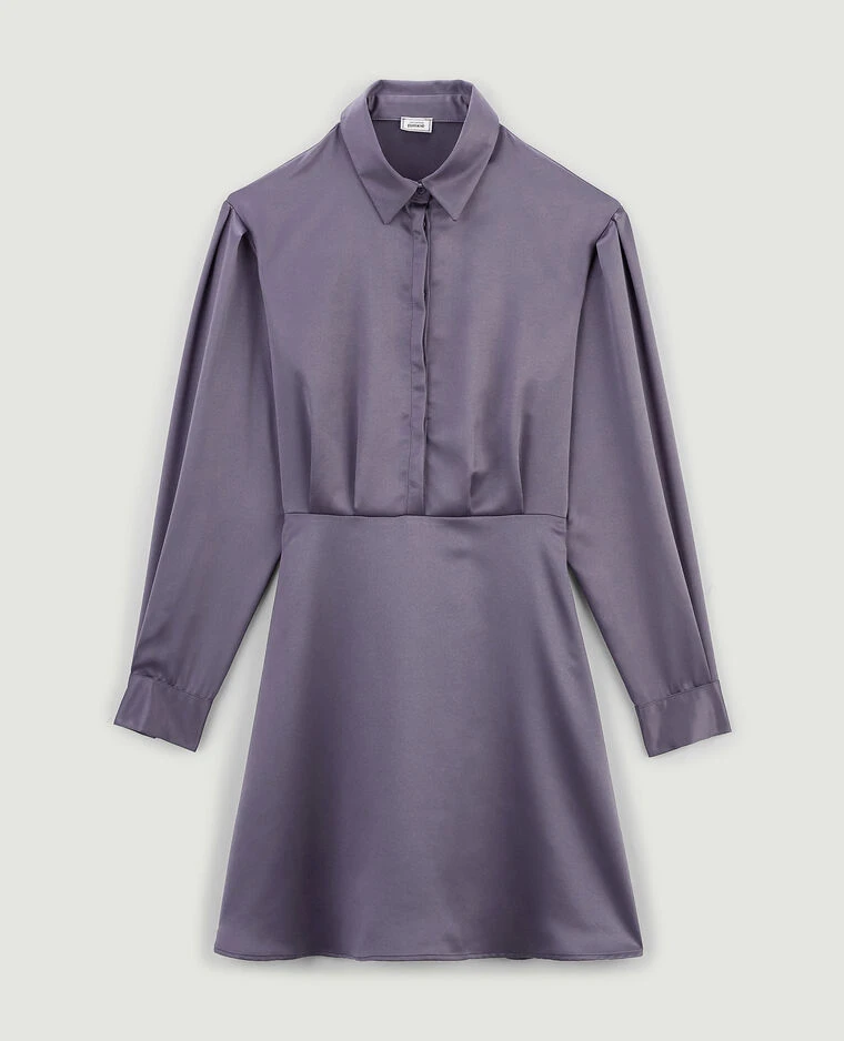 – Robe chemise courte en tissu satiné gris.