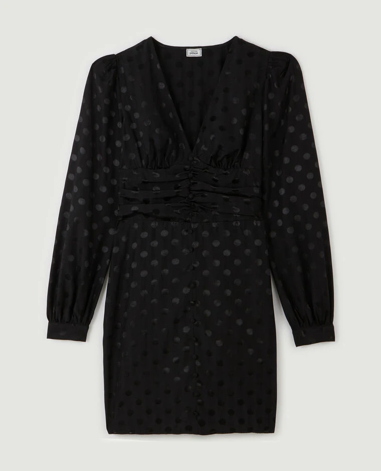 – Robe courte en tissu satiné noir avec pois ton sur ton.
