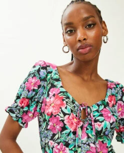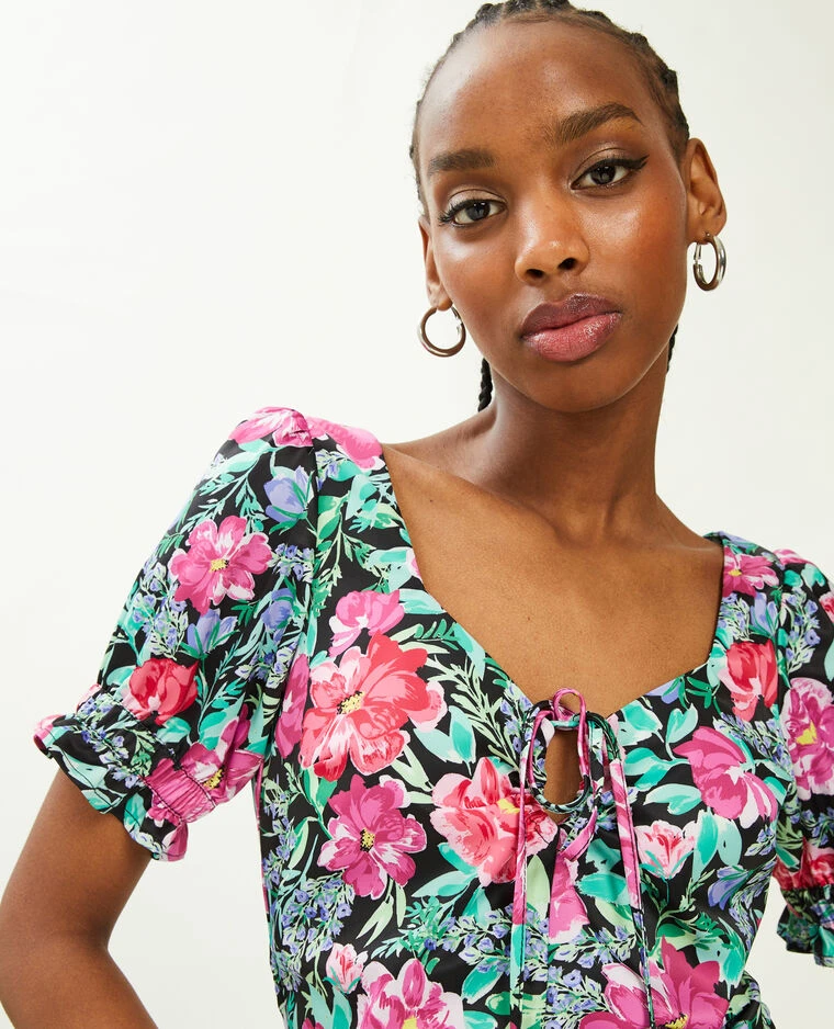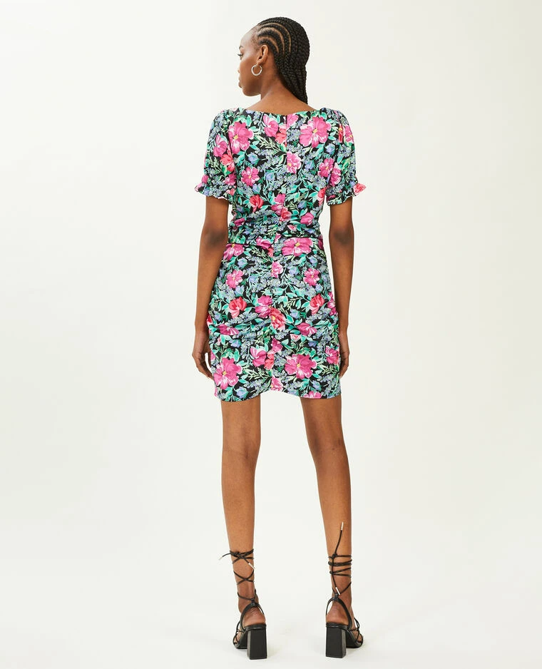 – Robe courte en tissu satinĂ© noir avec fleurs roses, vertes et lilas.