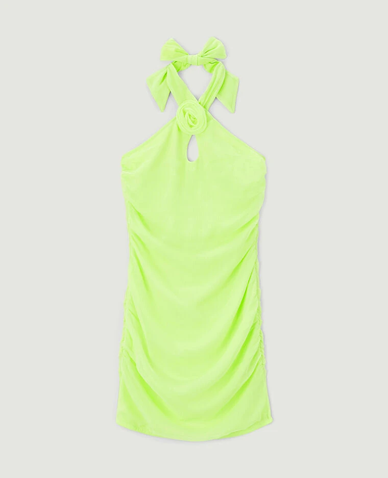 – Encolure américaine avec fleur et pans croisés à nouer dans la nuque.