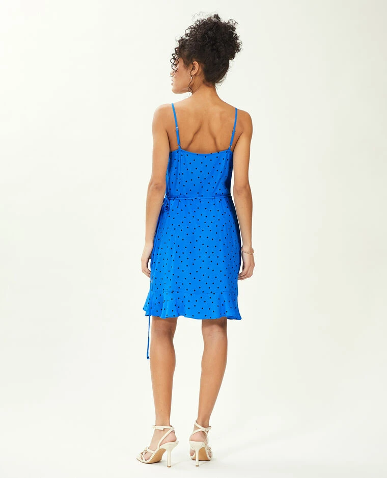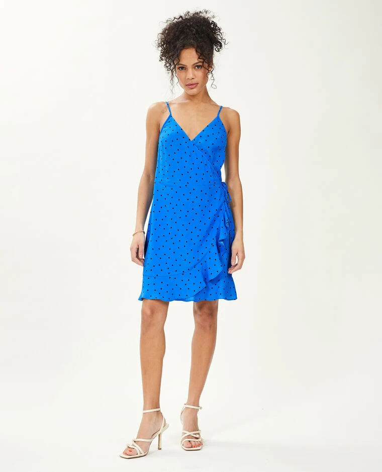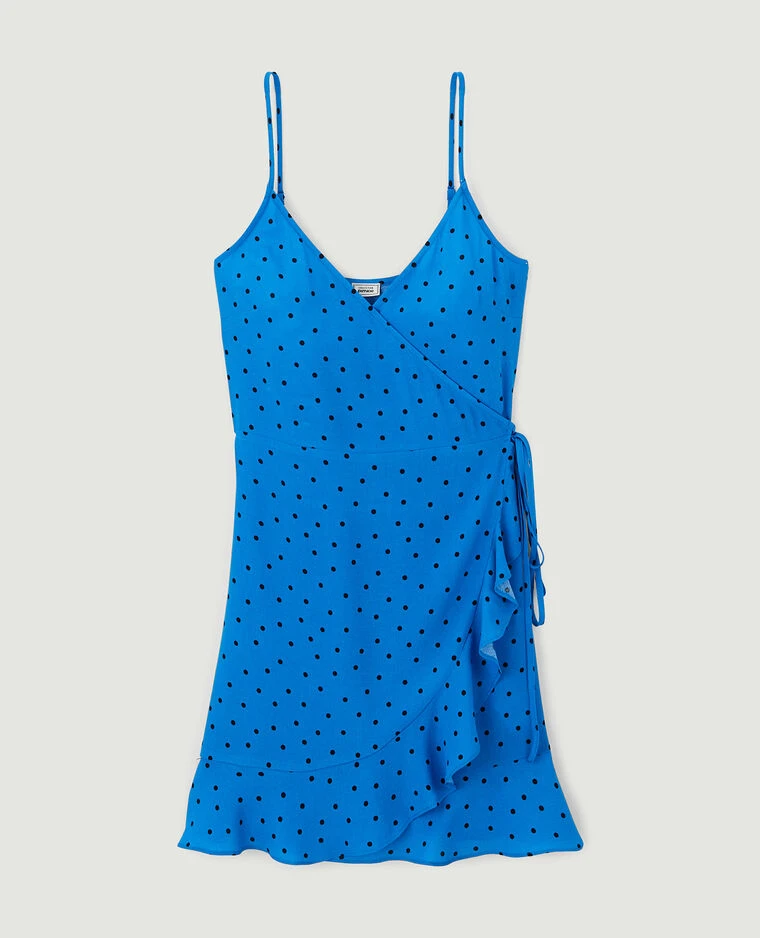 – Robe courte portefeuille en tissu fluide bleu Ă pois noirs.