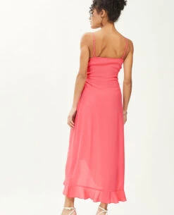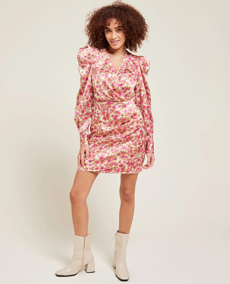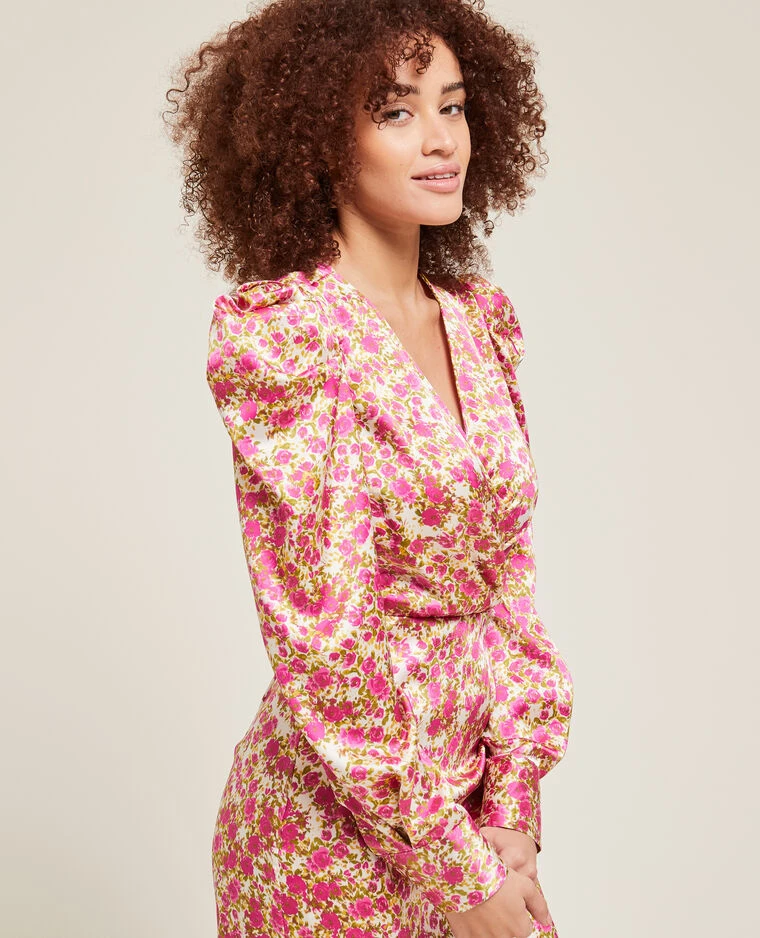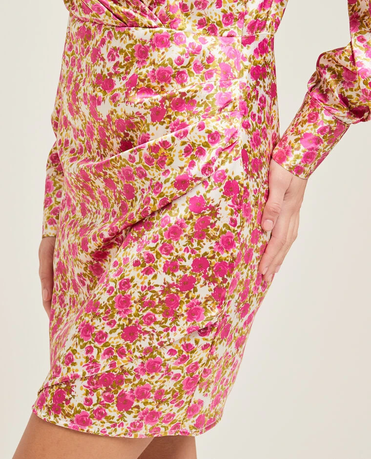– Robe courte en tissu satiné jaune pâle avec fleurs roses et vertes.