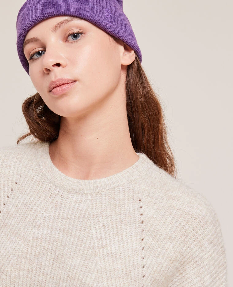 – Détails fantaisie de maille devant et le long des bras.