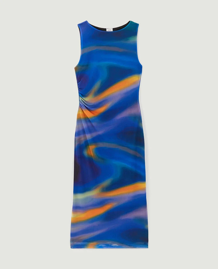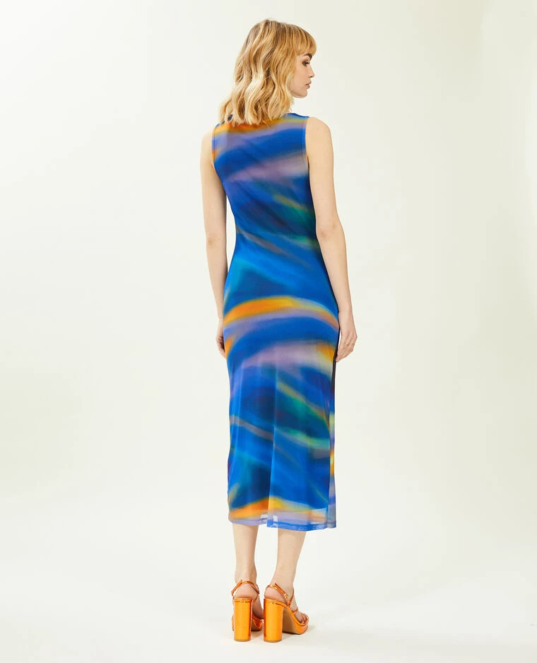 – Robe longue sans manche en maille micro-mesh bleu et orange.