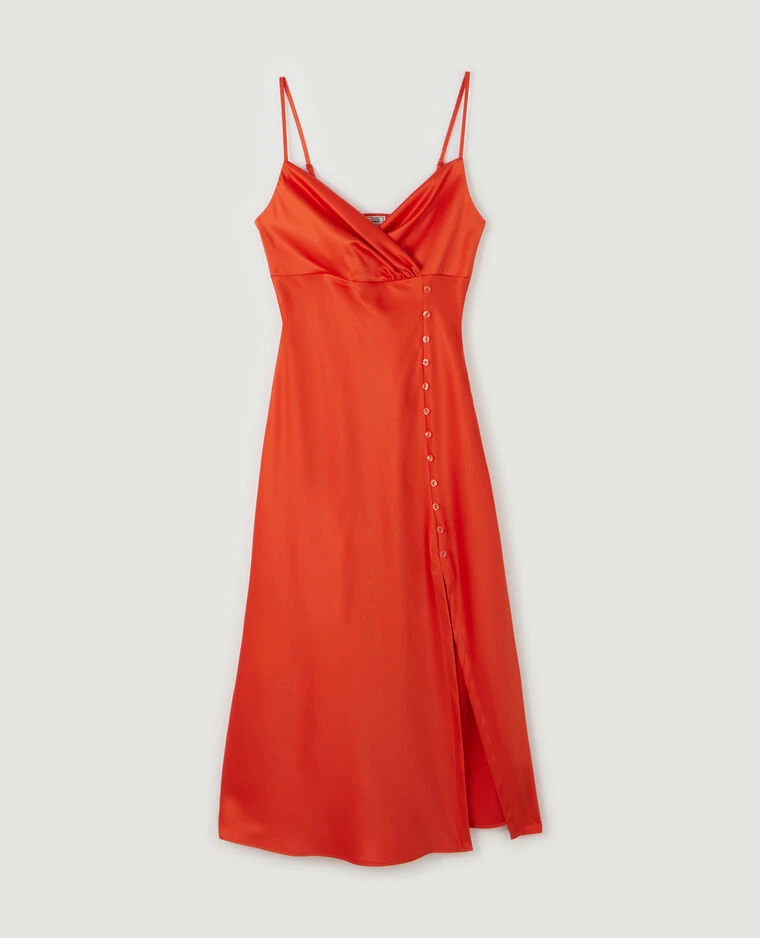 – Robe longue orange satinée.