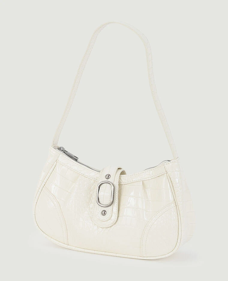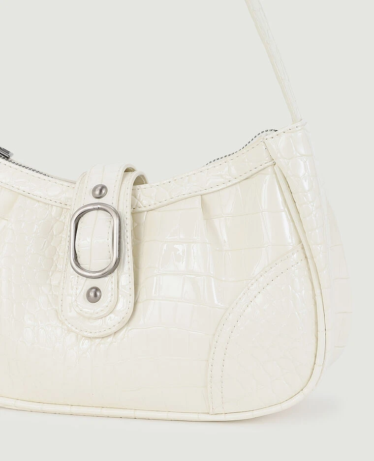 – Sac baguette en matière synthétique effet croco verni blanc.