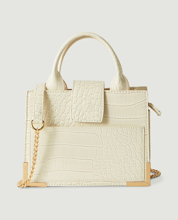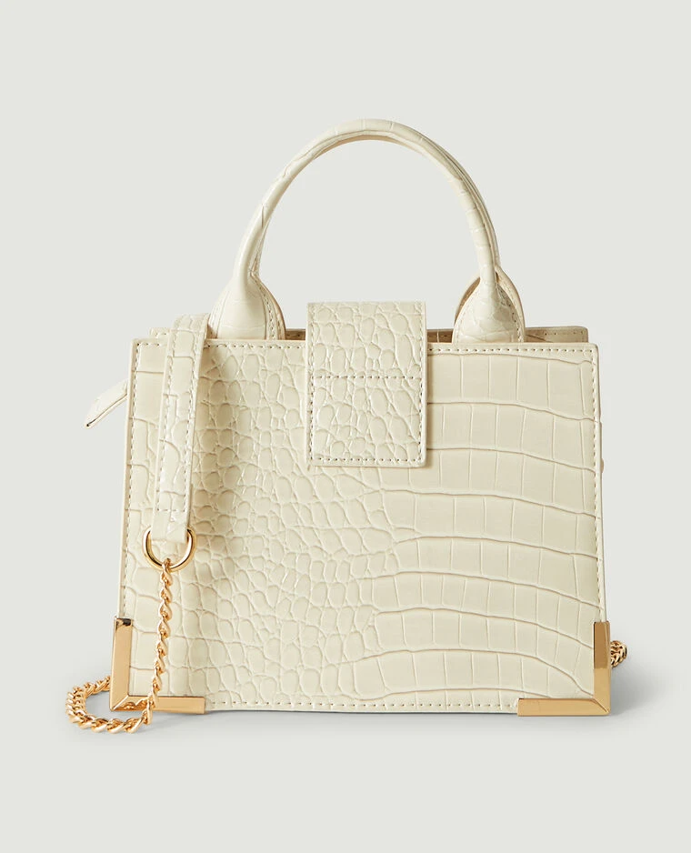 – Sac boxy en matière synthétique effet croco verni blanc cassé.