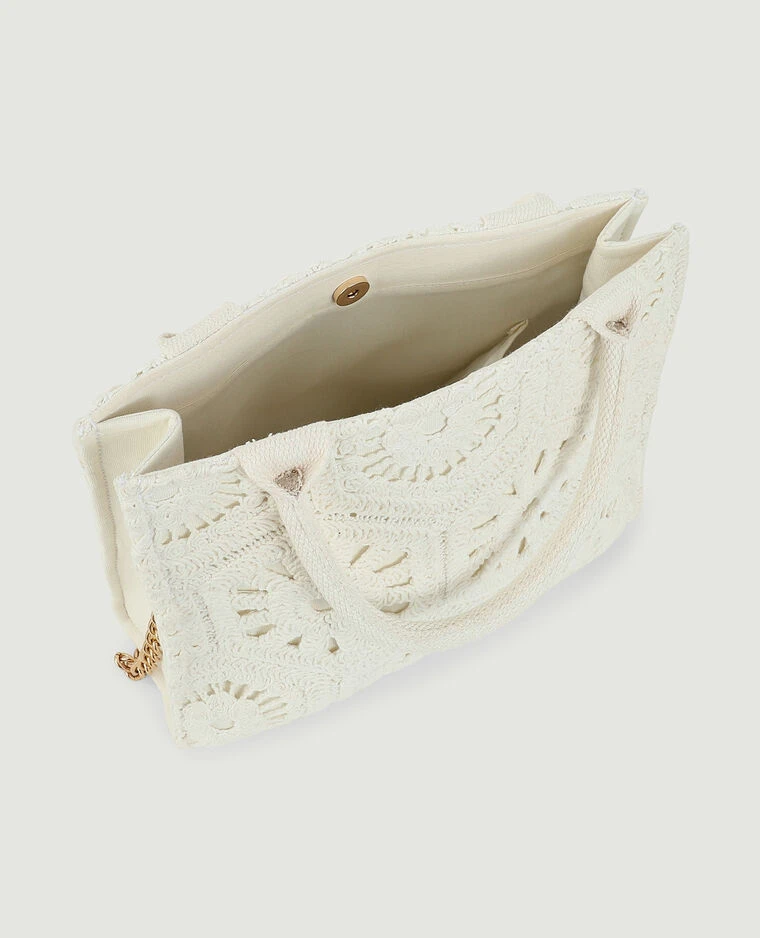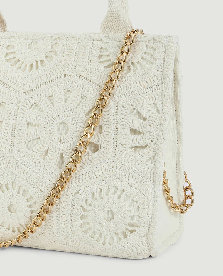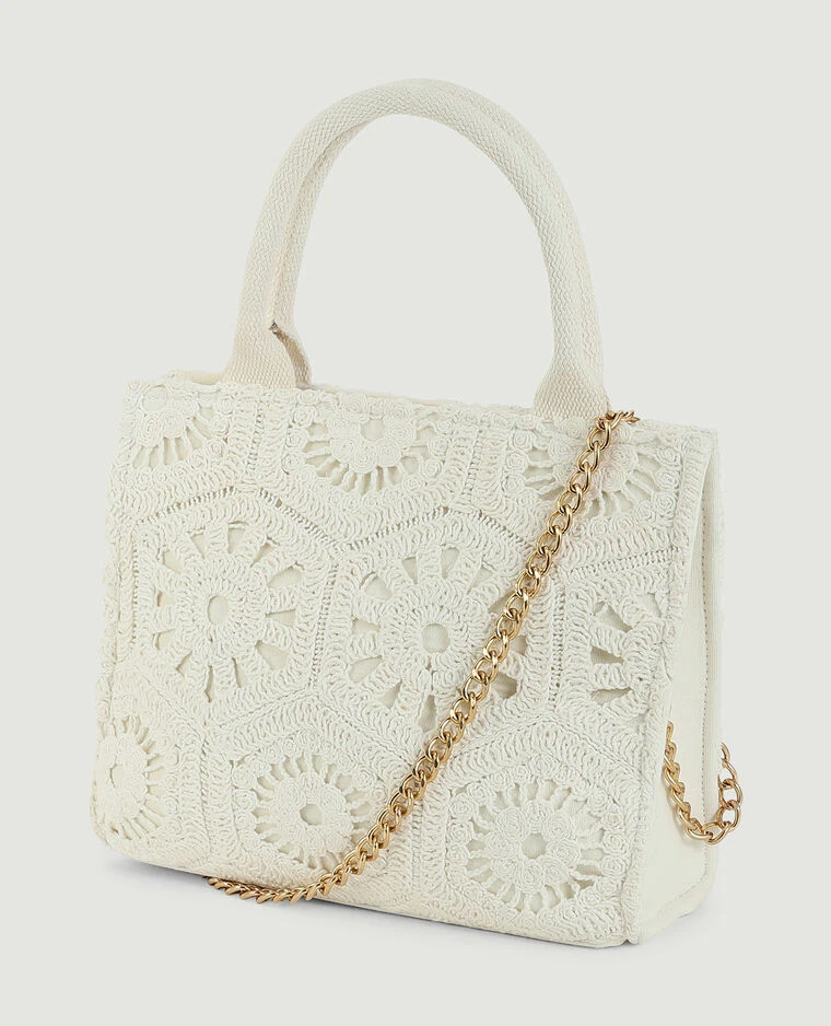 – Sac carré semi-rigide en crochet écru.