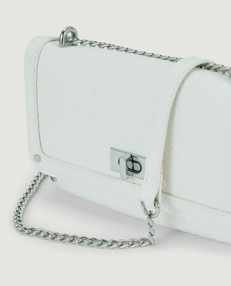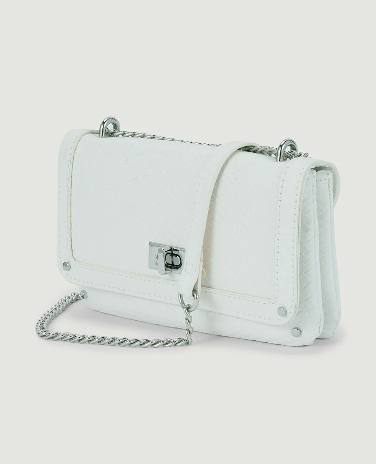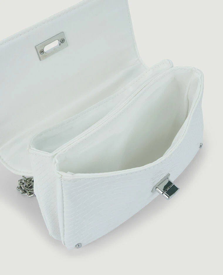 – Sac pochette blanc en matiĂšre synthĂ©tique effet serpent.