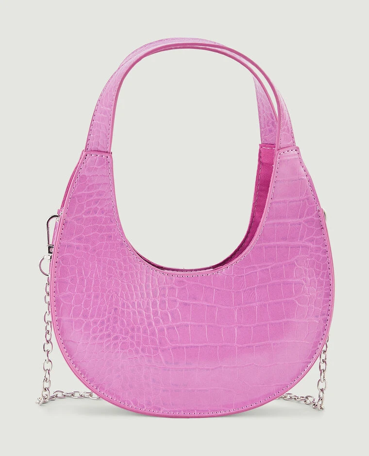 – Sac rond rigide en matiĂšre synthĂ©tique rose effet croco.