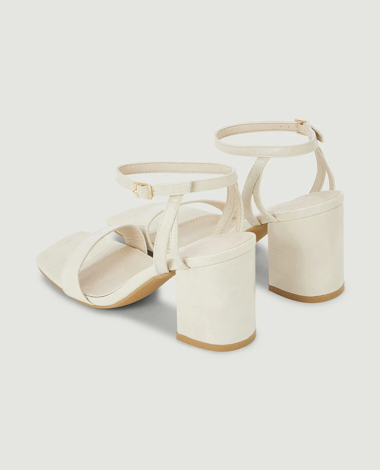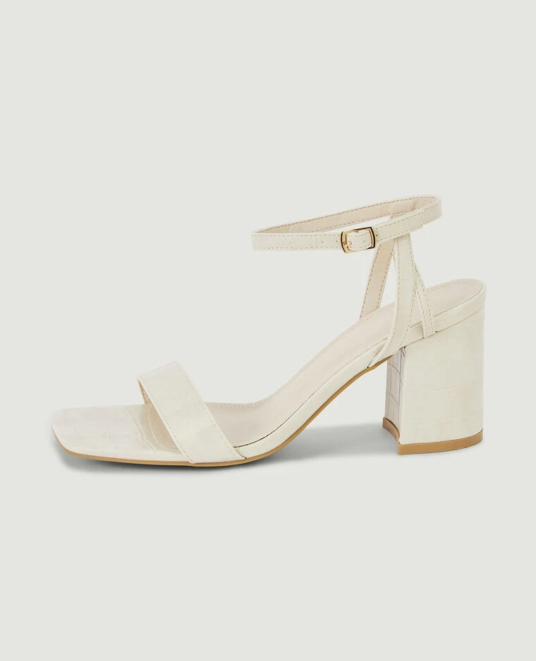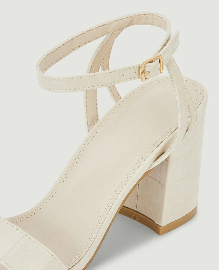 – Sandales à talon beiges en matière synthétique effet cuir façon croco.