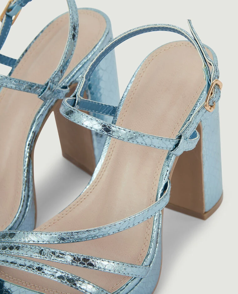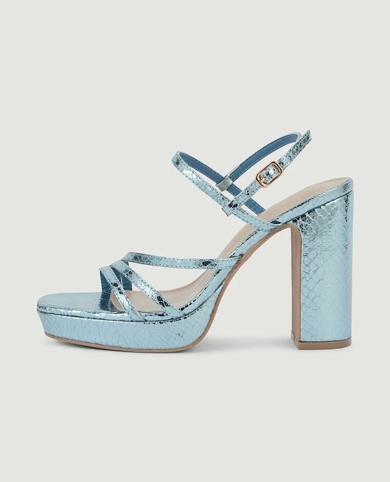 – Sandales plateformes en matière synthétique effet serpent bleu métallisé.