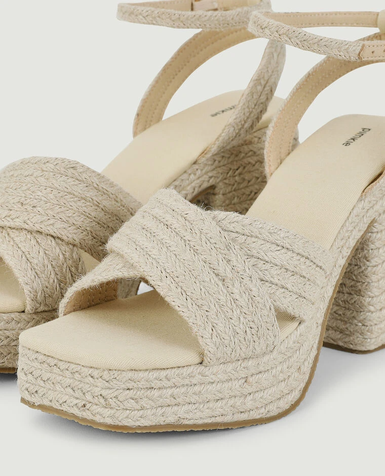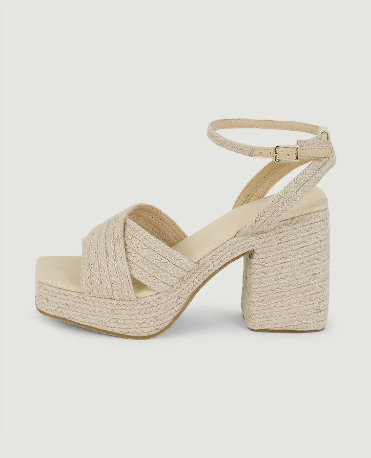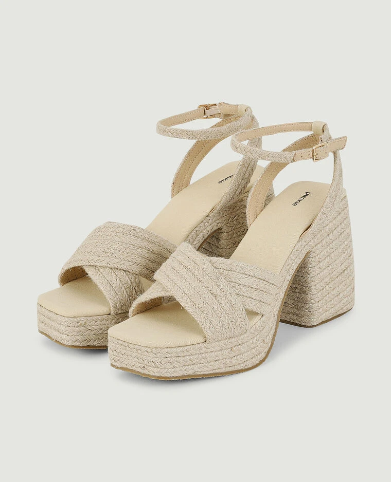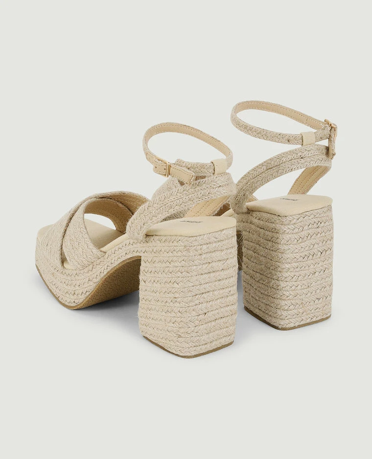 – Sandales plateformes en matière synthétique effet cuir, recouvert de corde tressée.