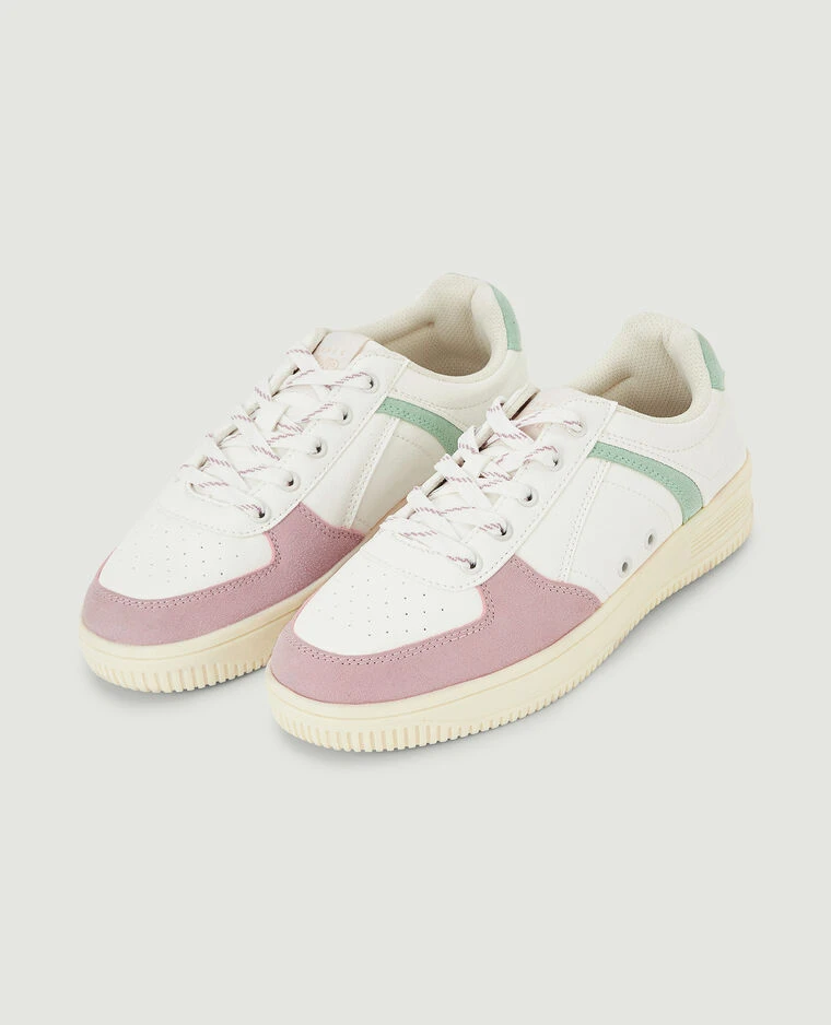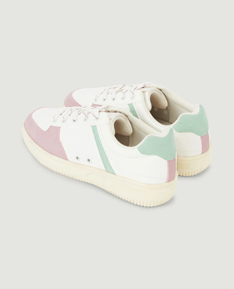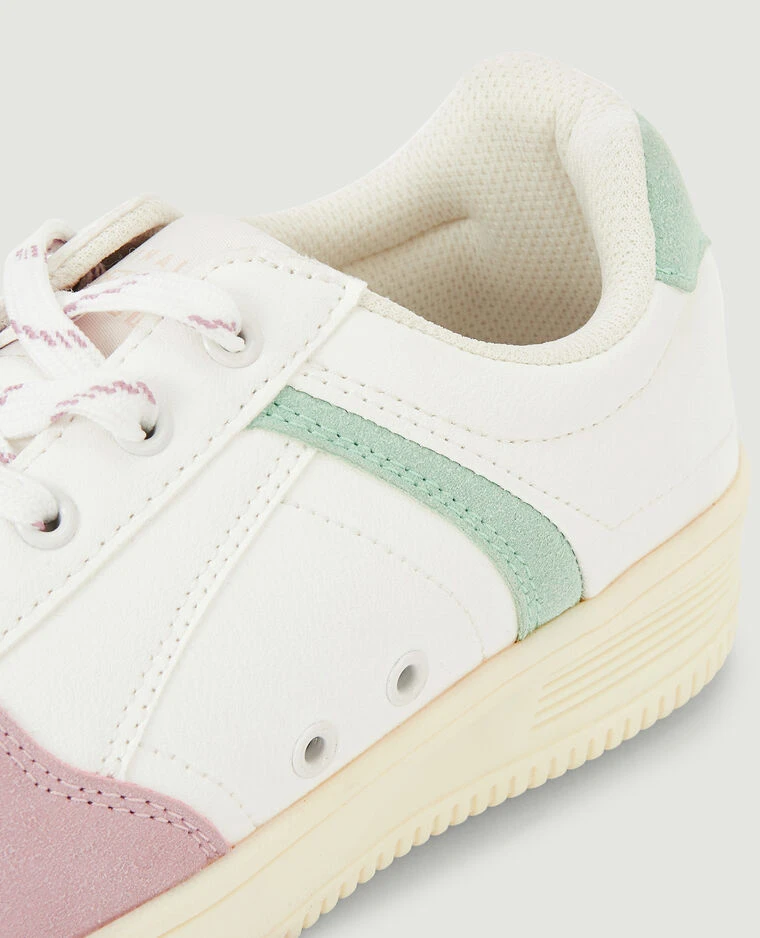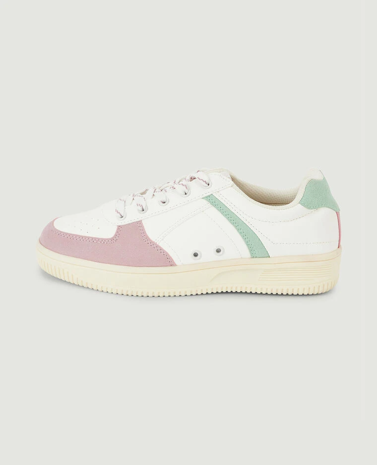 – Sneakers bi-matière blanches avec détails rose pâle et vert aqua.