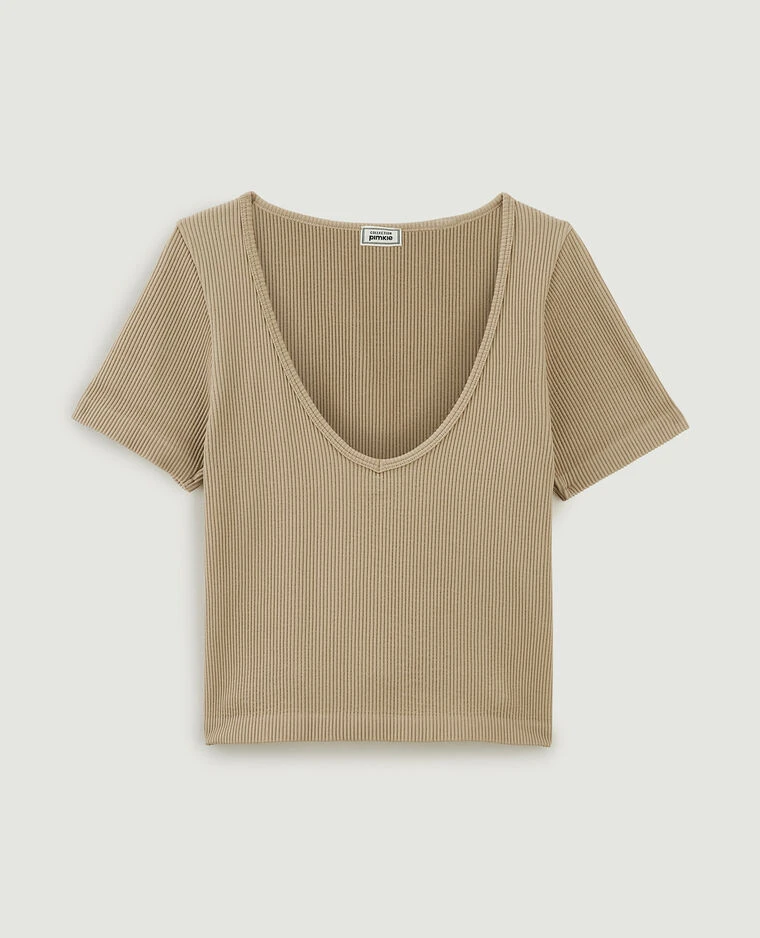 – T-shirt cropped en maille côtelée beige.