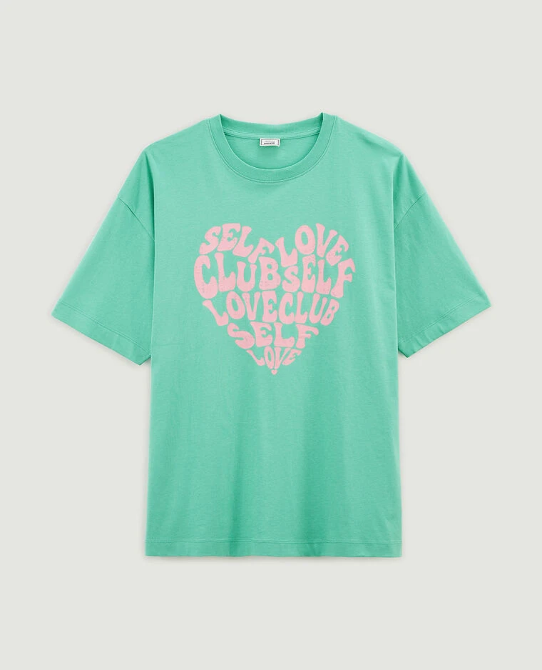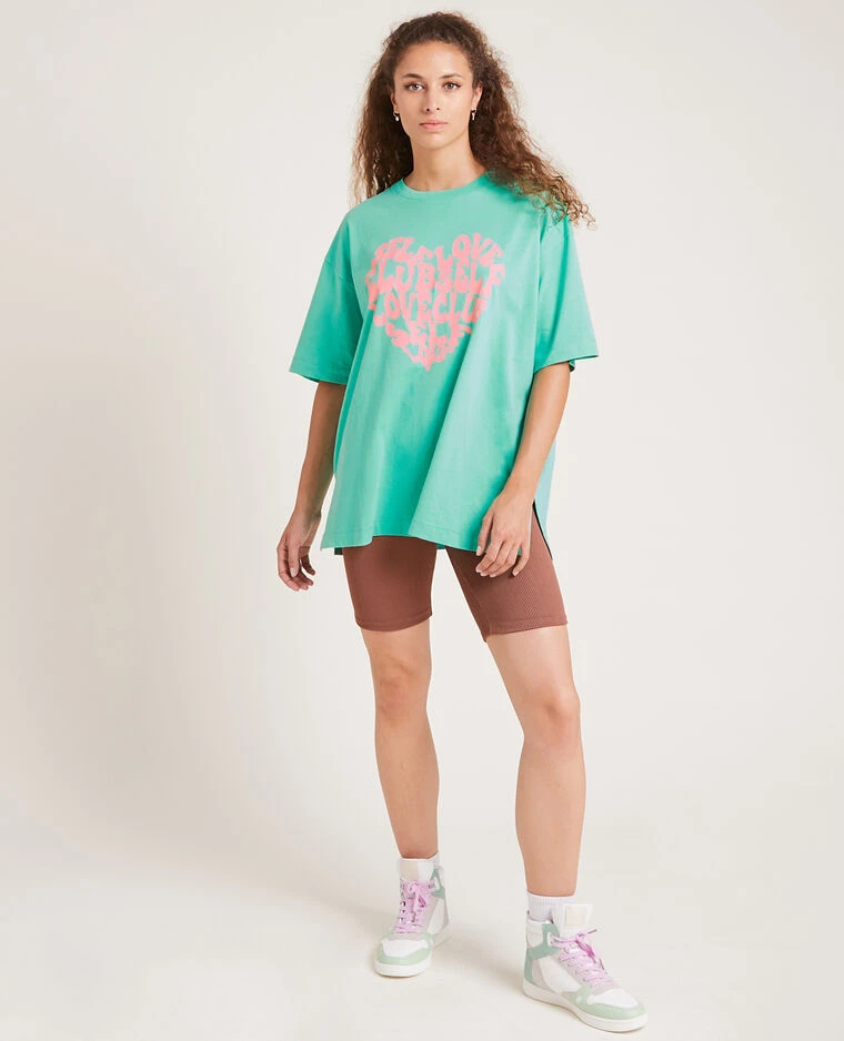 – T-shirt oversize vert avec grande inscription cœur rose devant.
