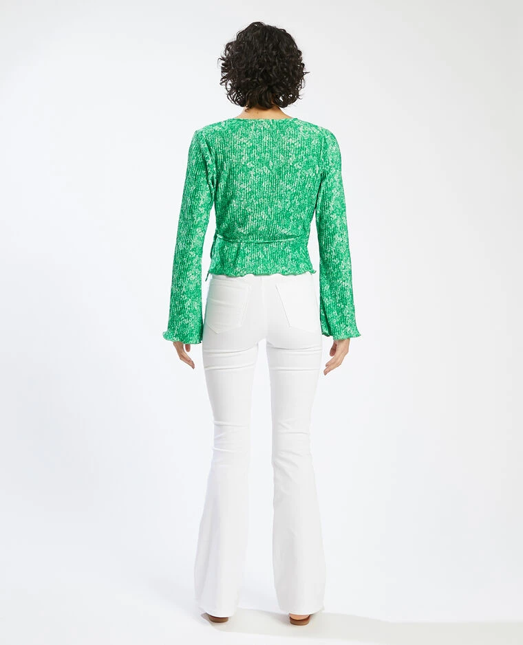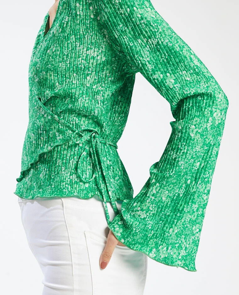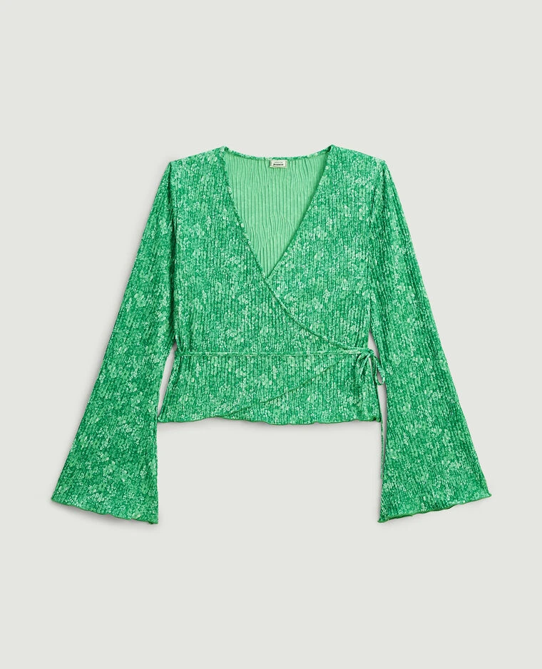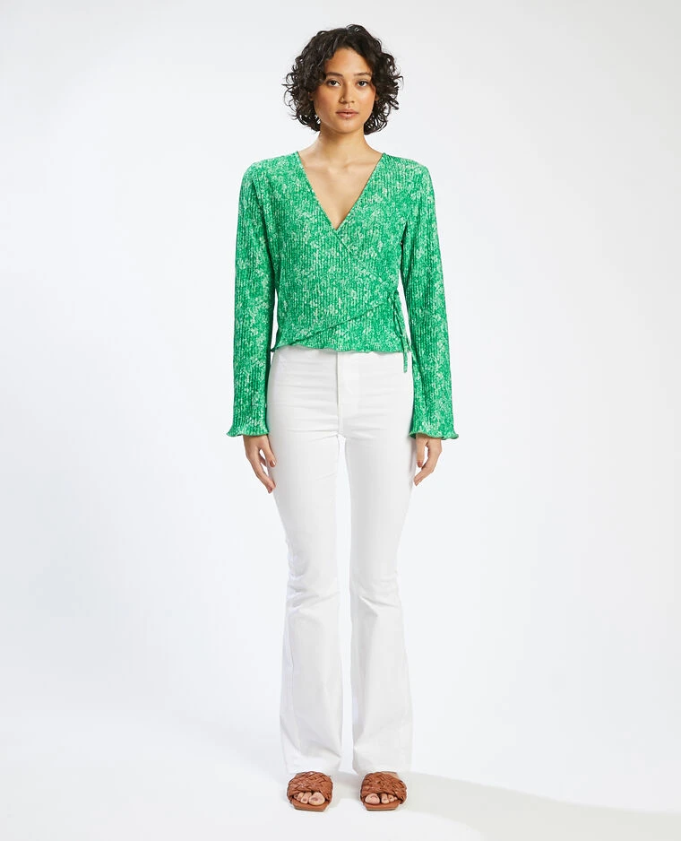 – Top en maille plissée verte avec petites fleurs.