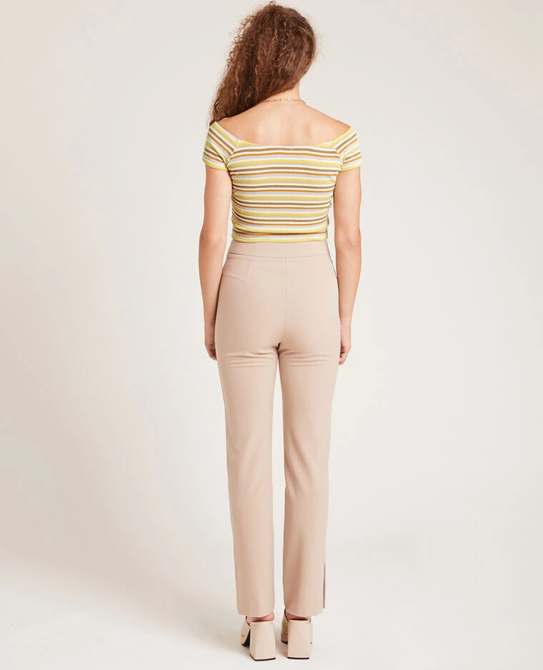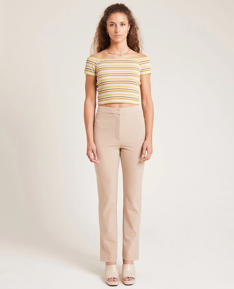 – Top court en maille tricot rayée parme, marron, beige, jaune, écru.
