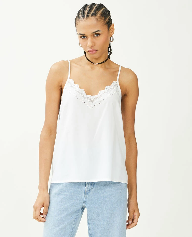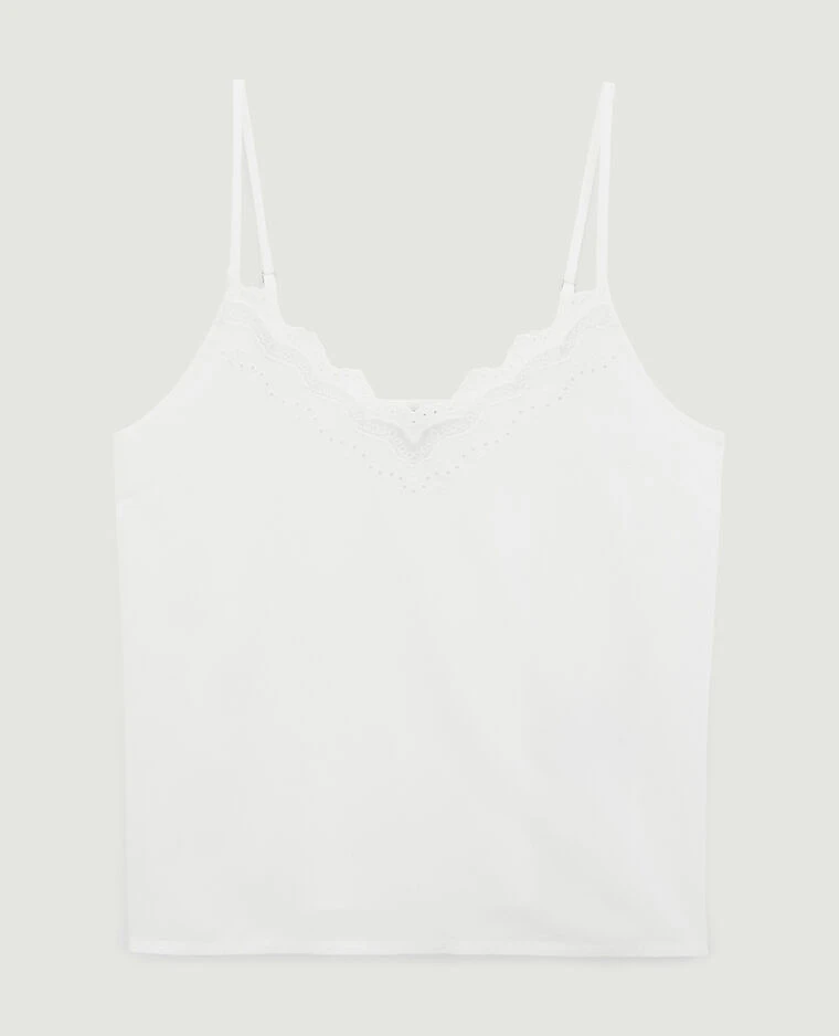 – Top blanc cassé en tissu fluide avec empiècement dentelle devant.