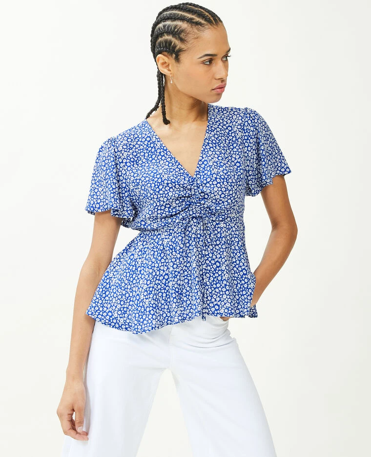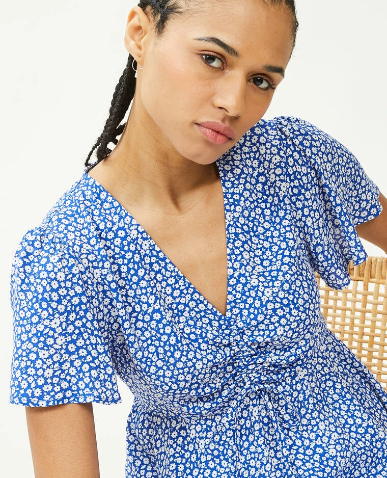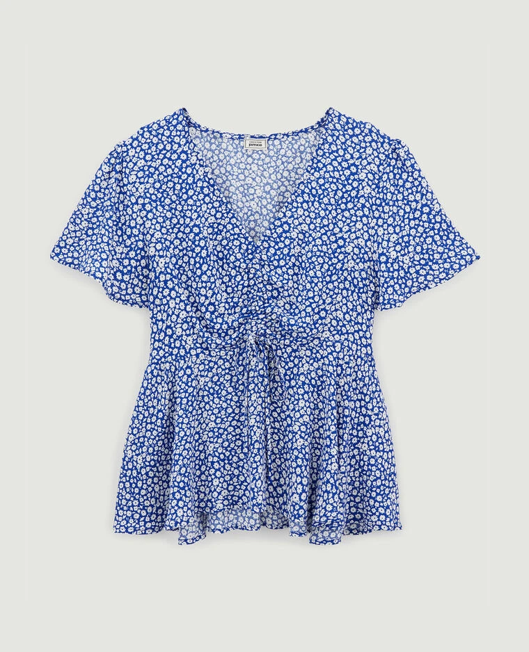 – Top en tissu fluide bleu avec petites fleurs blanches.