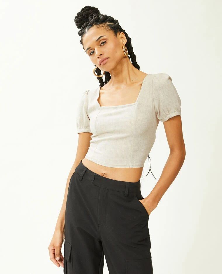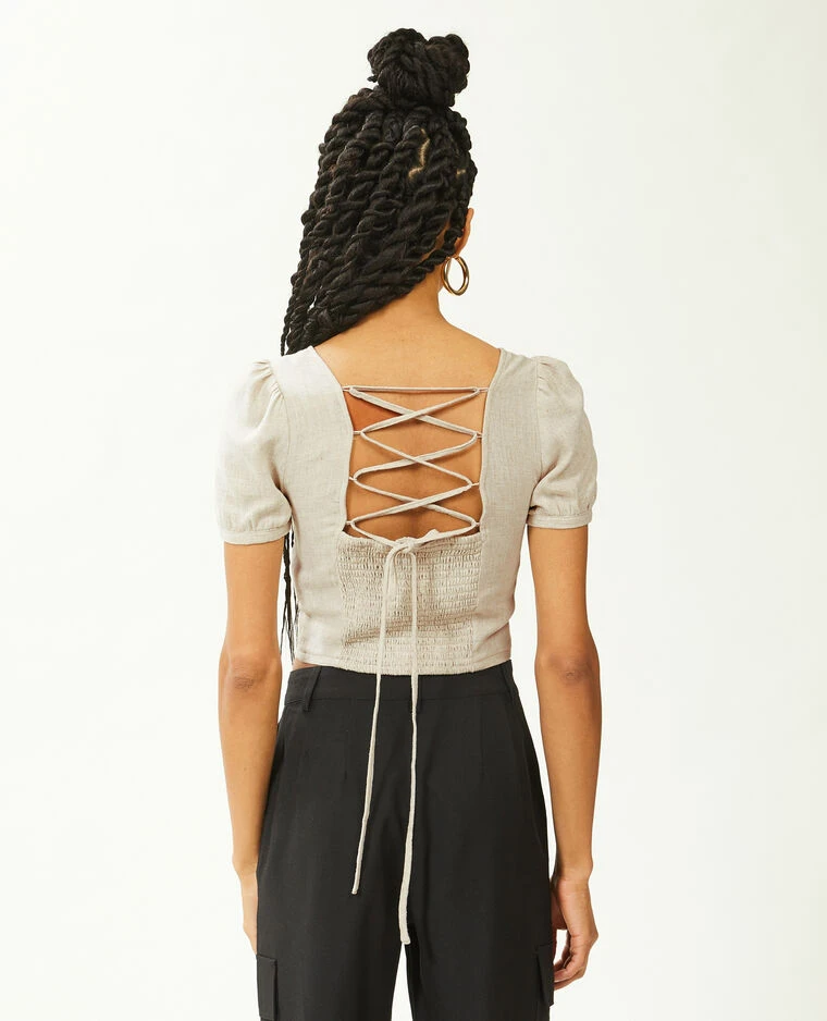– Top court en tissu beige contenant du lin.