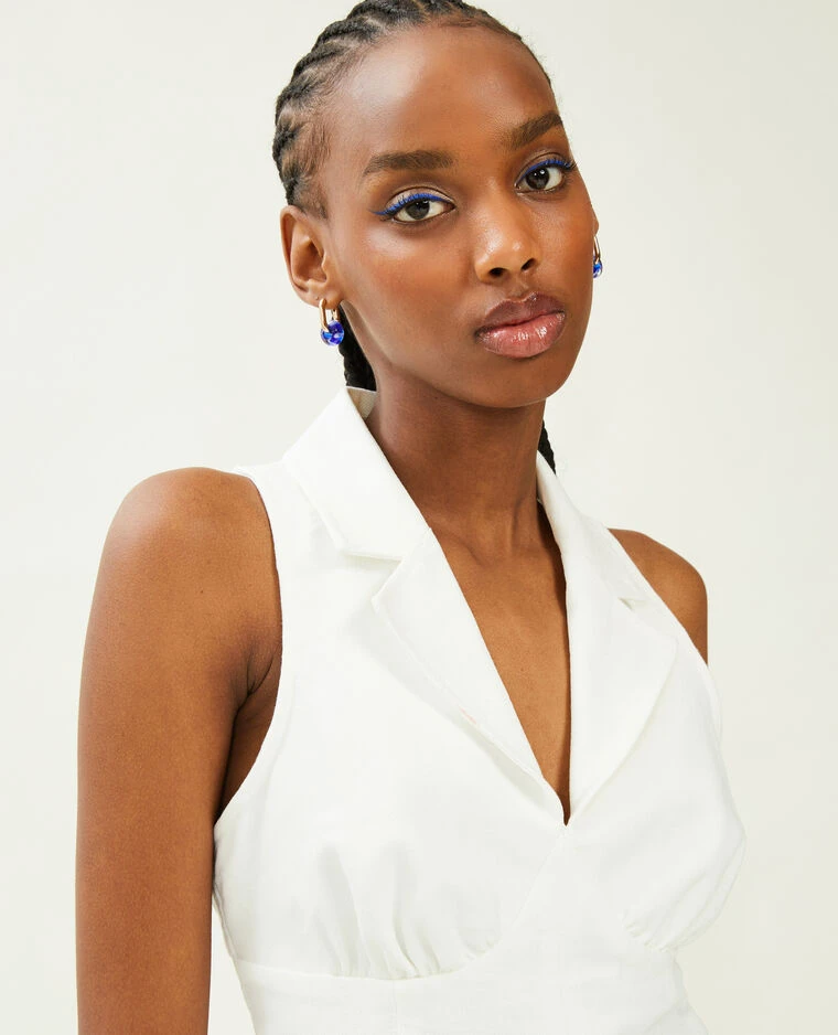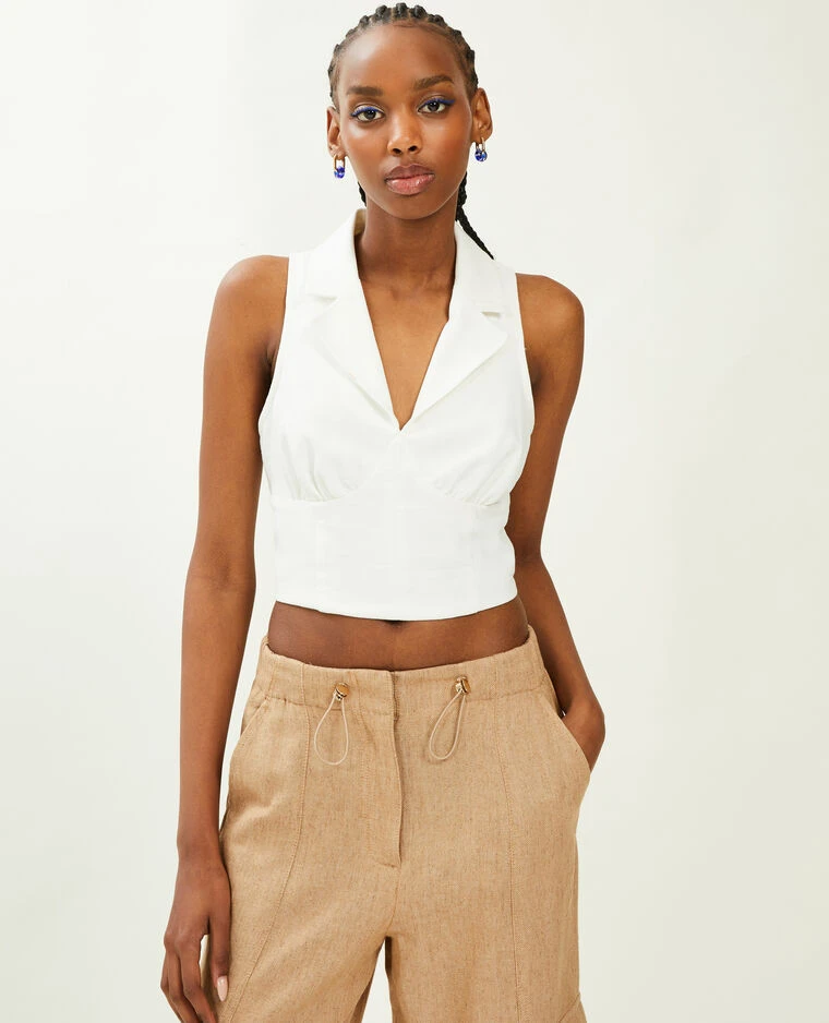 – Top court façon gilet de barman en tissu effet rustique blanc.